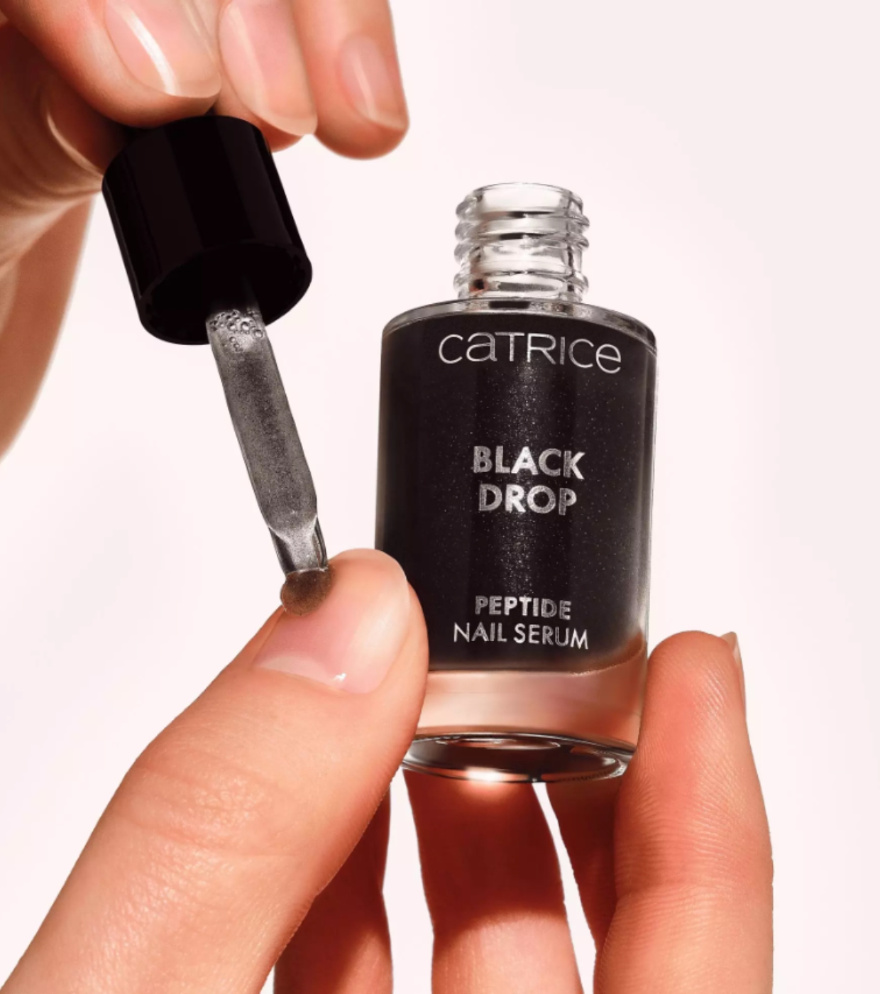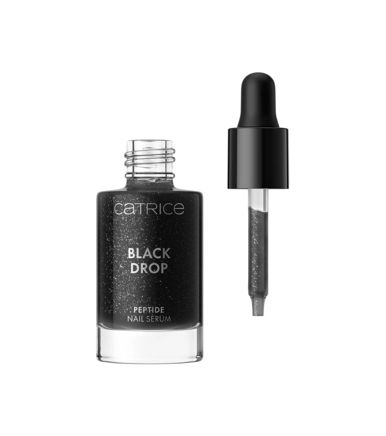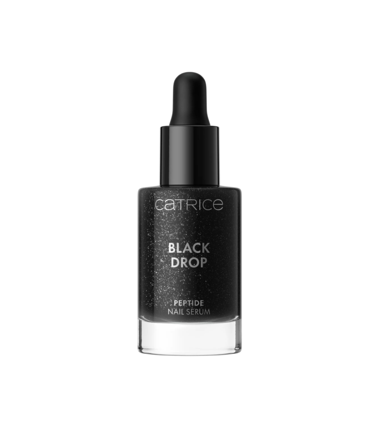 Beleza e cuidado se unem com um toque ousado graças ao Black Drop Peptide Nail Serum da Catrice .