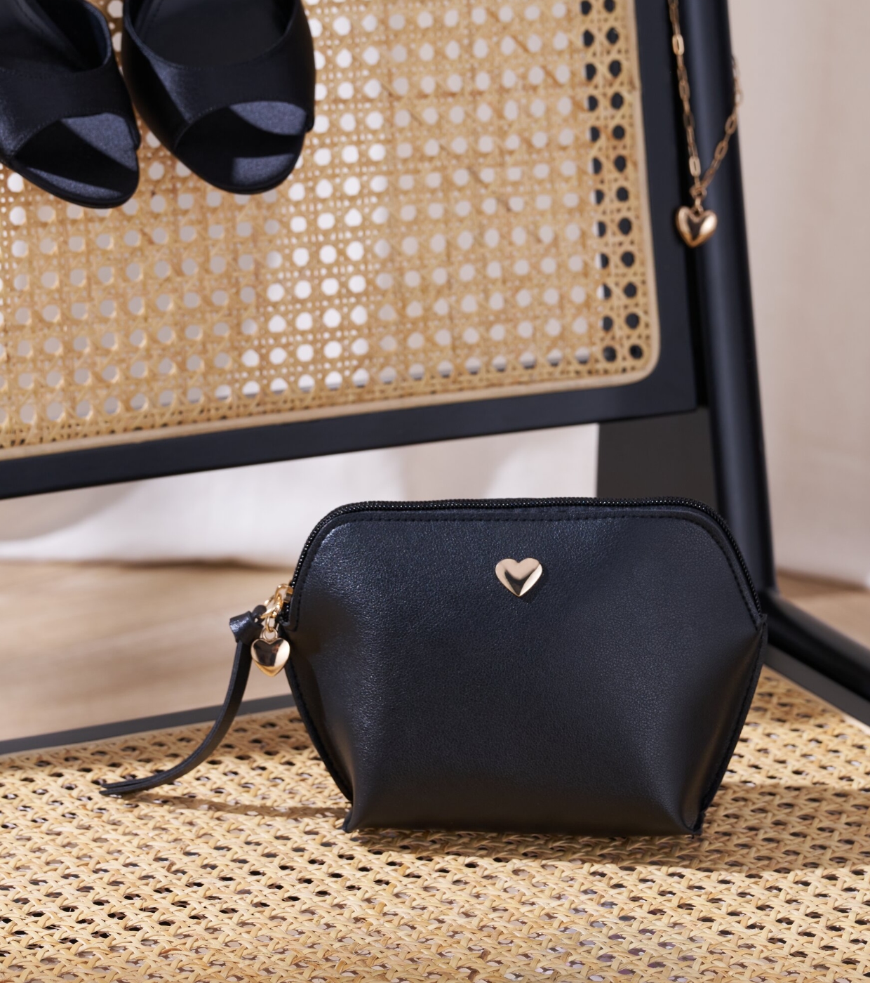 O acabamento em couro sintético preto é combinado com detalhes dourados, como o delicado coração metálico na parte frontal e a alça em formato de coração, conferindo um toque romântico e sofisticado.