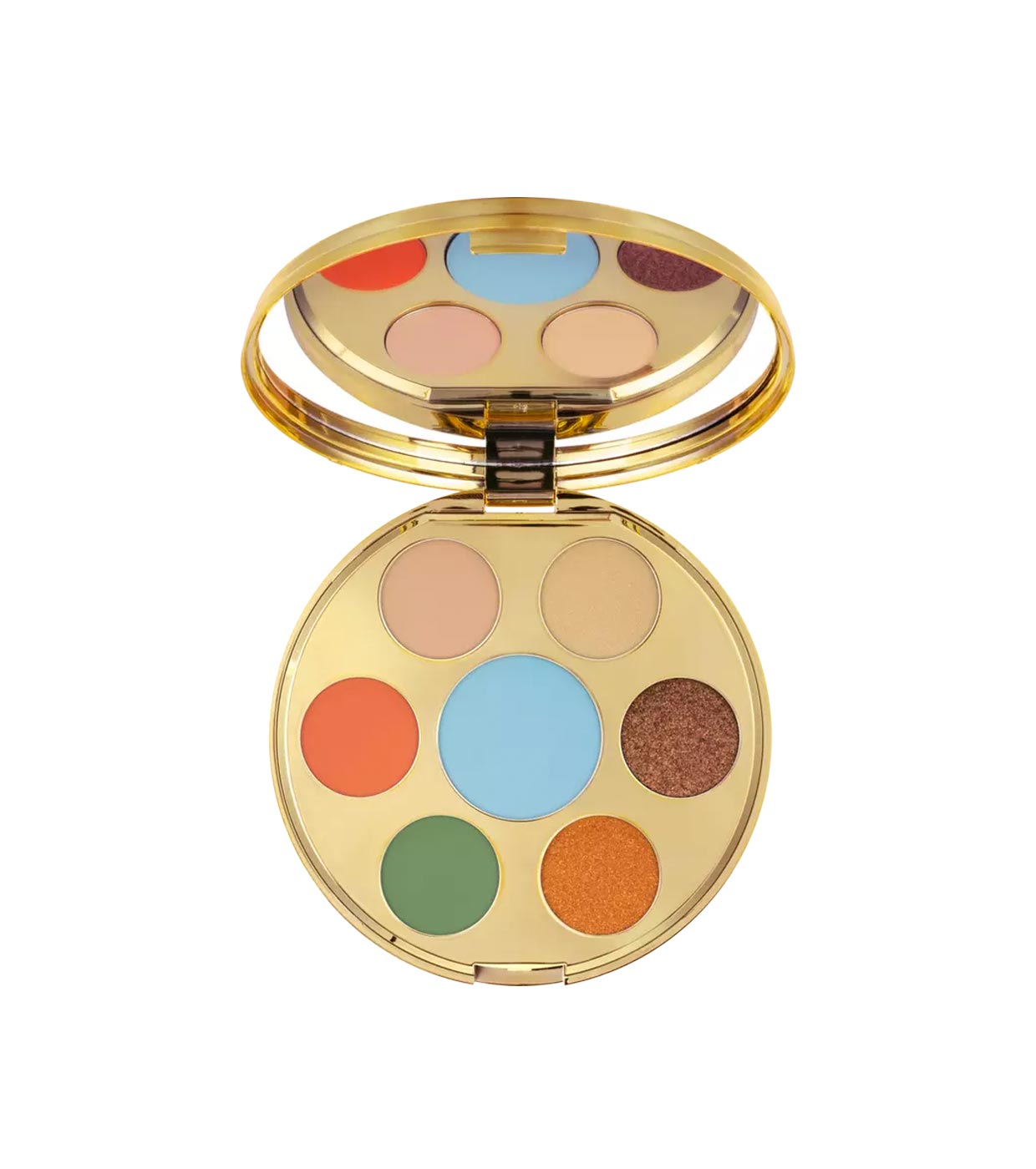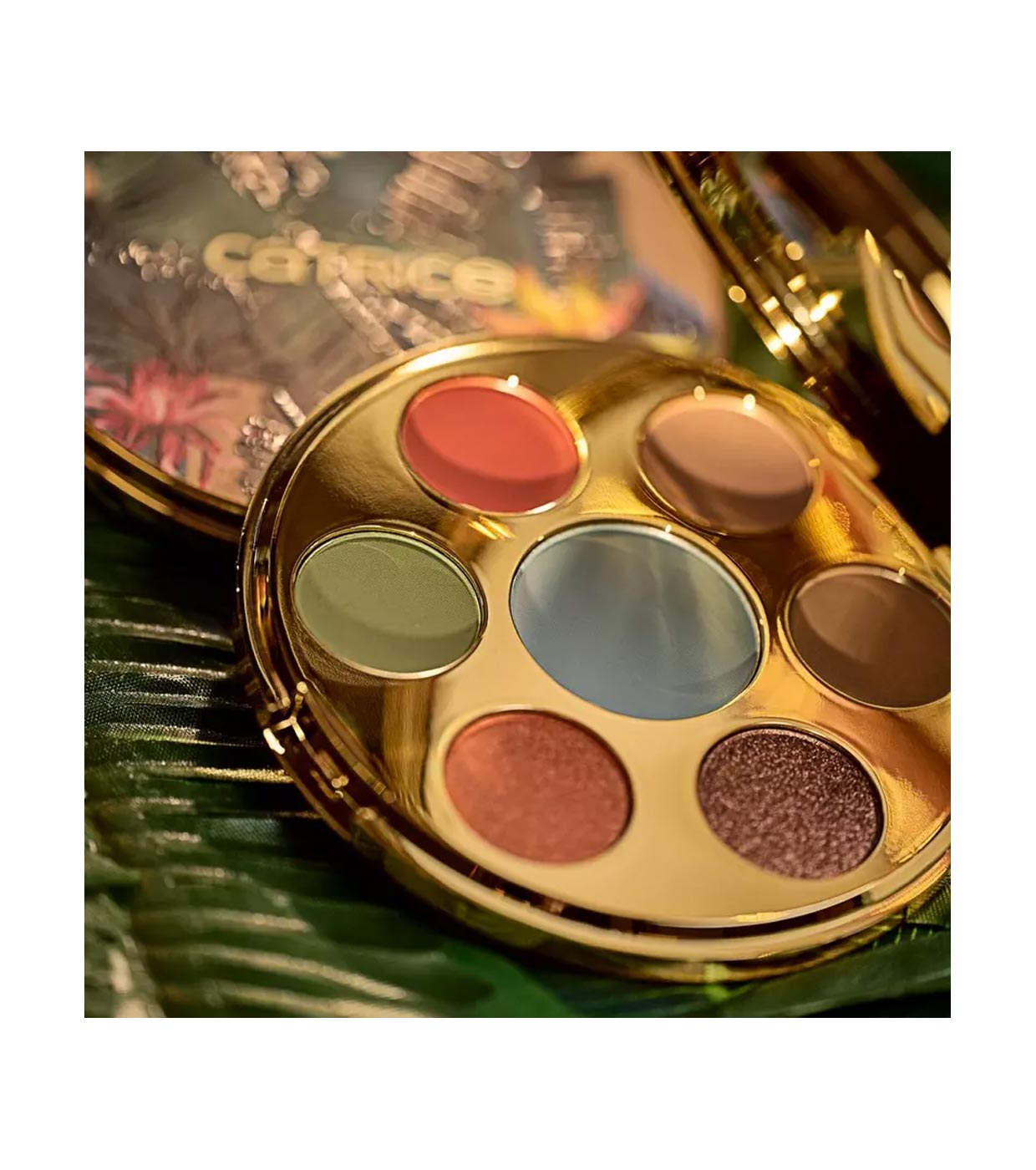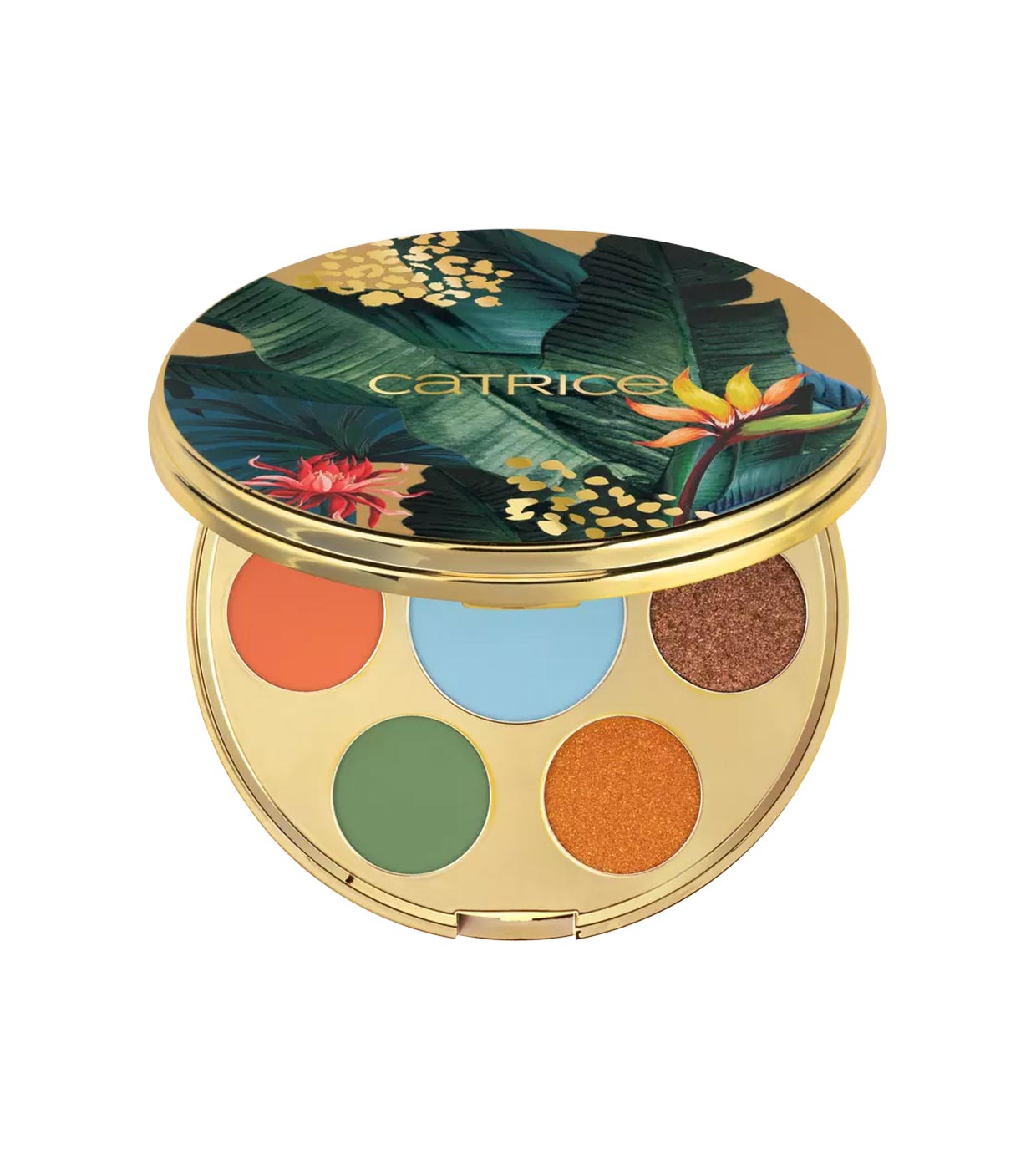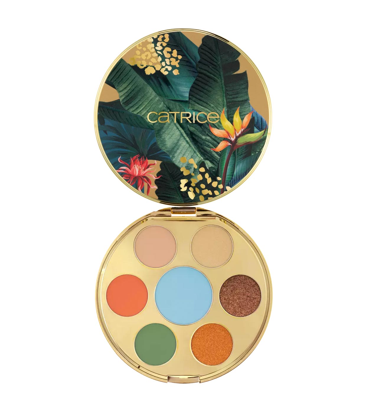 Esta paleta de sombras chama a atenção com seu design exótico e espelho integrado: folhas verdes de palmeira, aplicações douradas e flores exóticas no design lembram a natureza tropical.