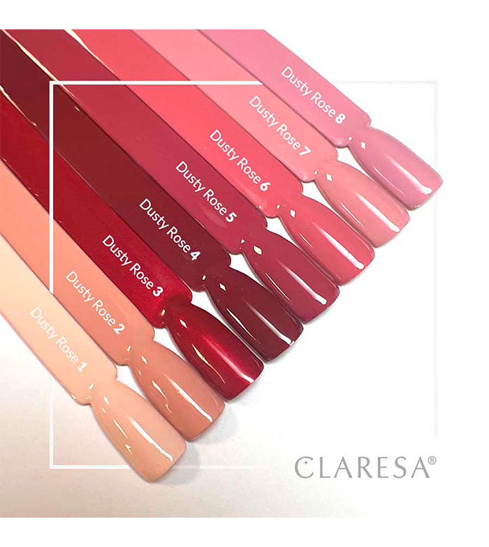 A coleção Dusty Rose da Claresa é composta por 8 esmaltes semipermanentes na gama de vermelhos, rosas e nus, alguns deles com acabamento metálico.