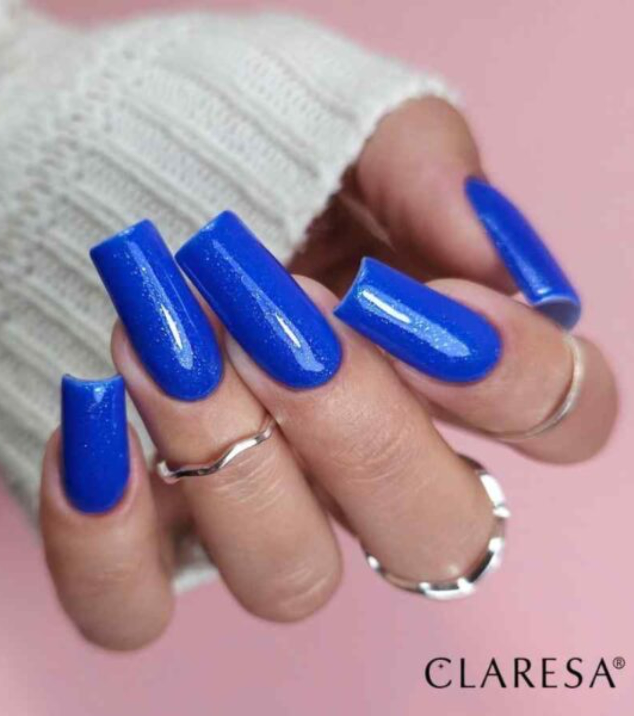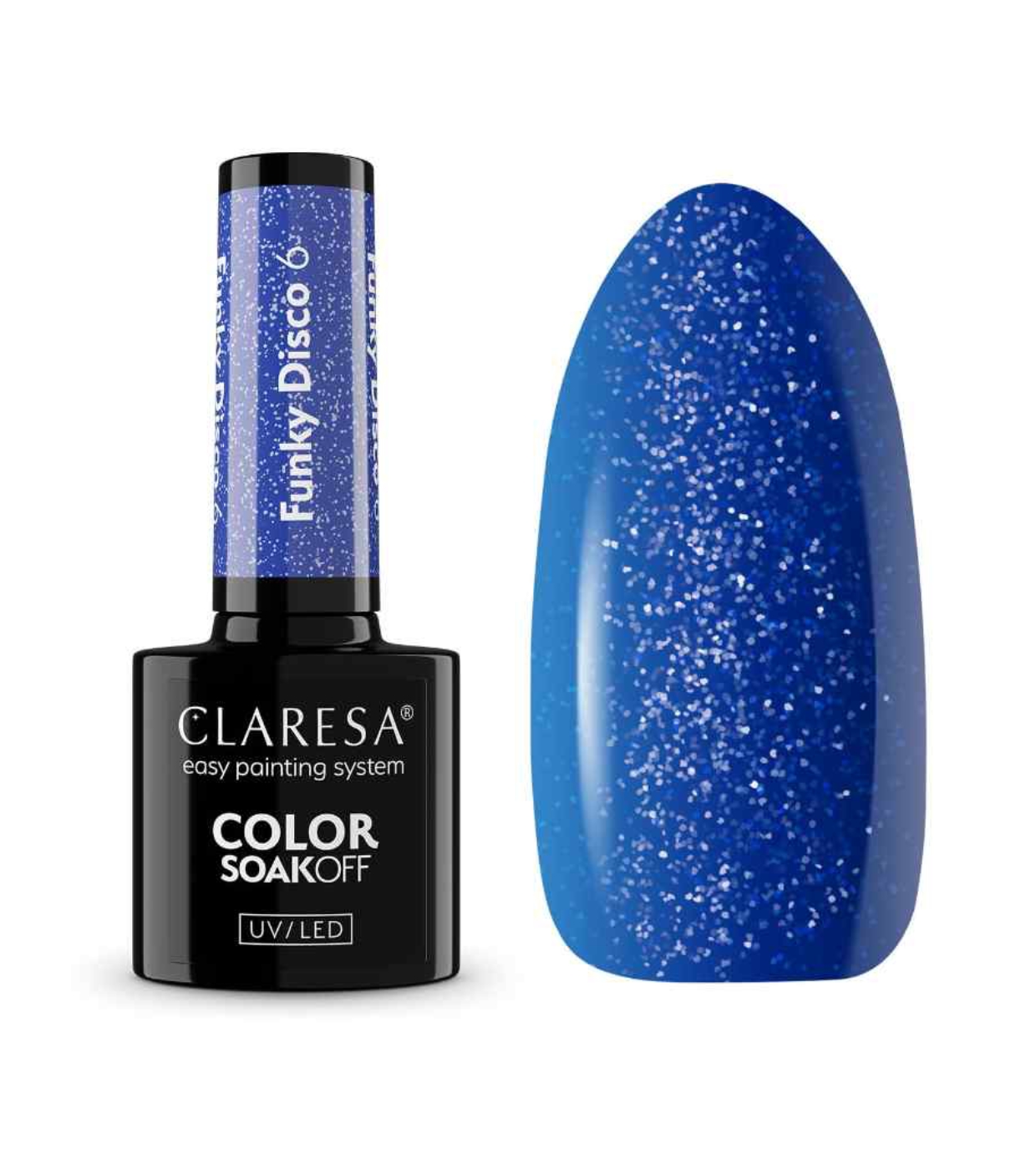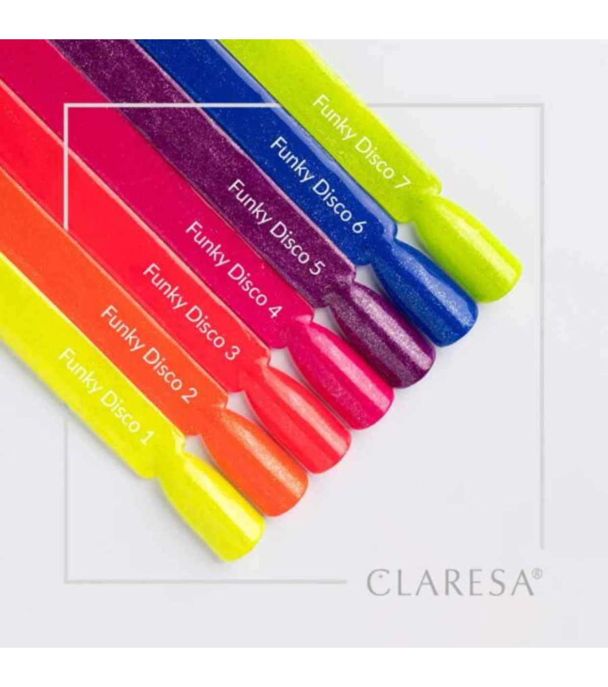 A coleção Funky Disco da Claresa inclui 7 esmaltes semipermanentes em tons vibrantes de rosa, laranja, amarelo, verde, azul e roxo, todos adornados com milhares de partículas brilhantes.