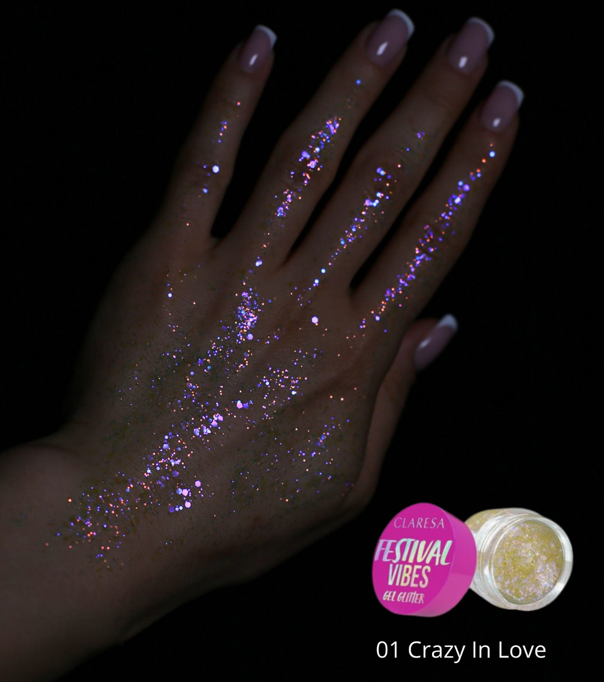 Sinta a vibração do festival na sua pele com Festival Vibes Festival Vibes Glitter Gel , o gel glitter que transforma qualquer look em uma explosão de luz e cor.