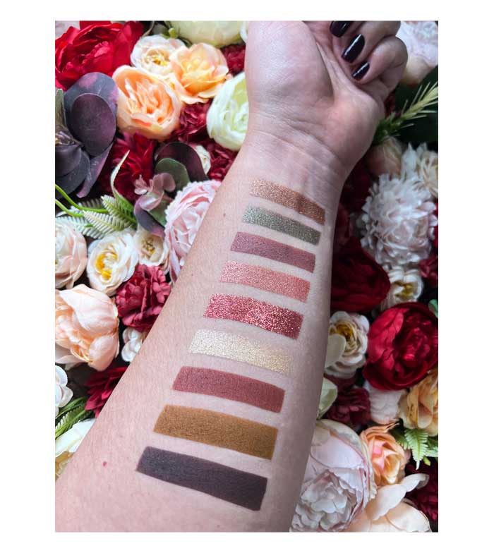 Uma paleta composta por 9 sombras em uma variedade de acabamentos que vão do fosco aos tons metálicos e brilhantes.