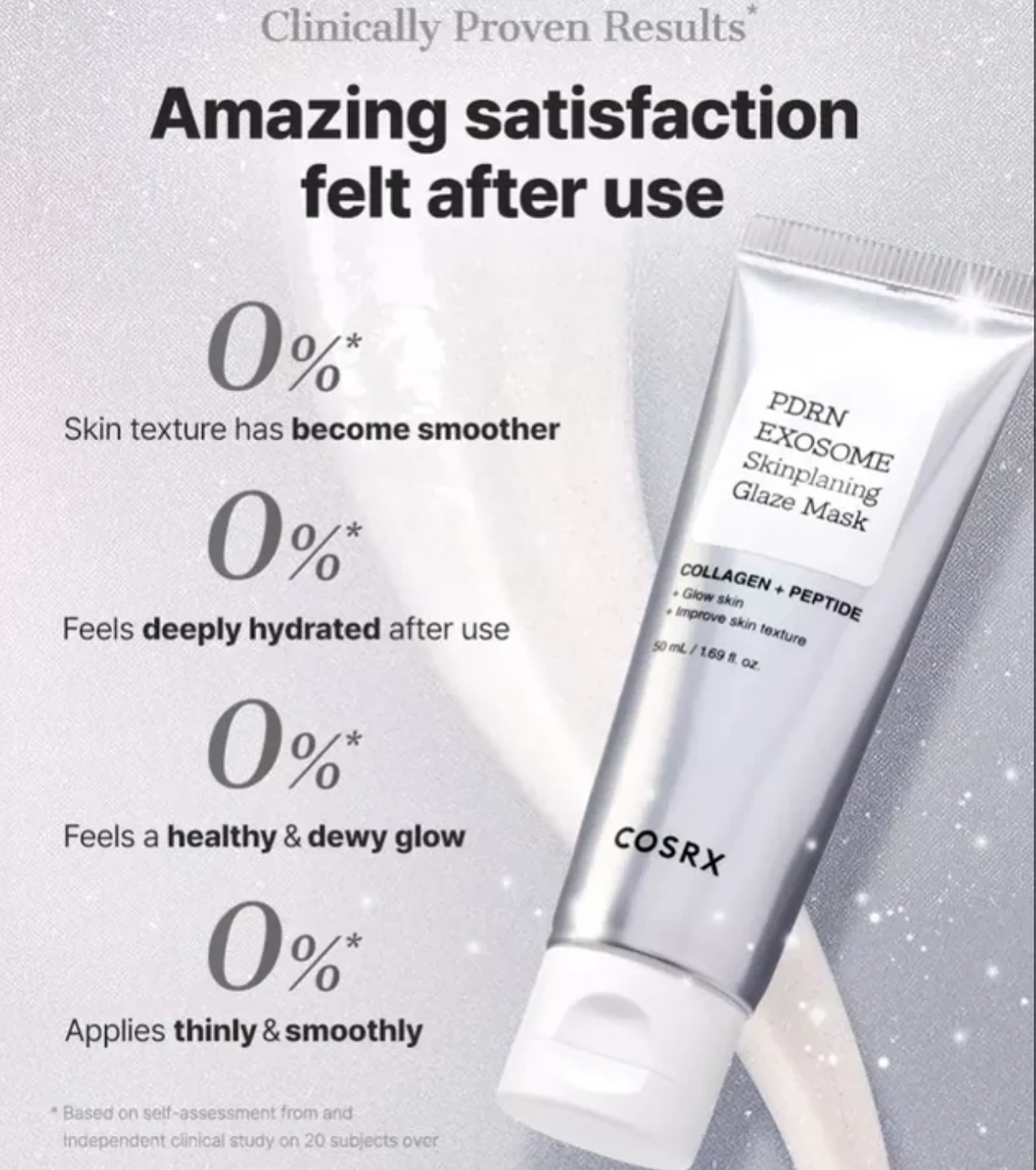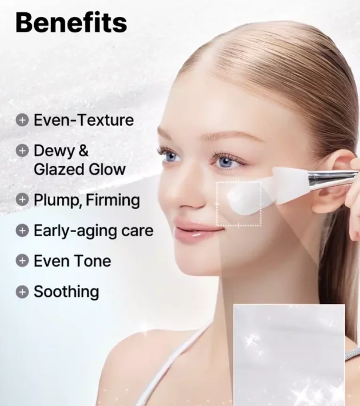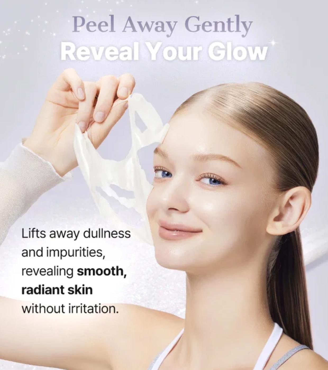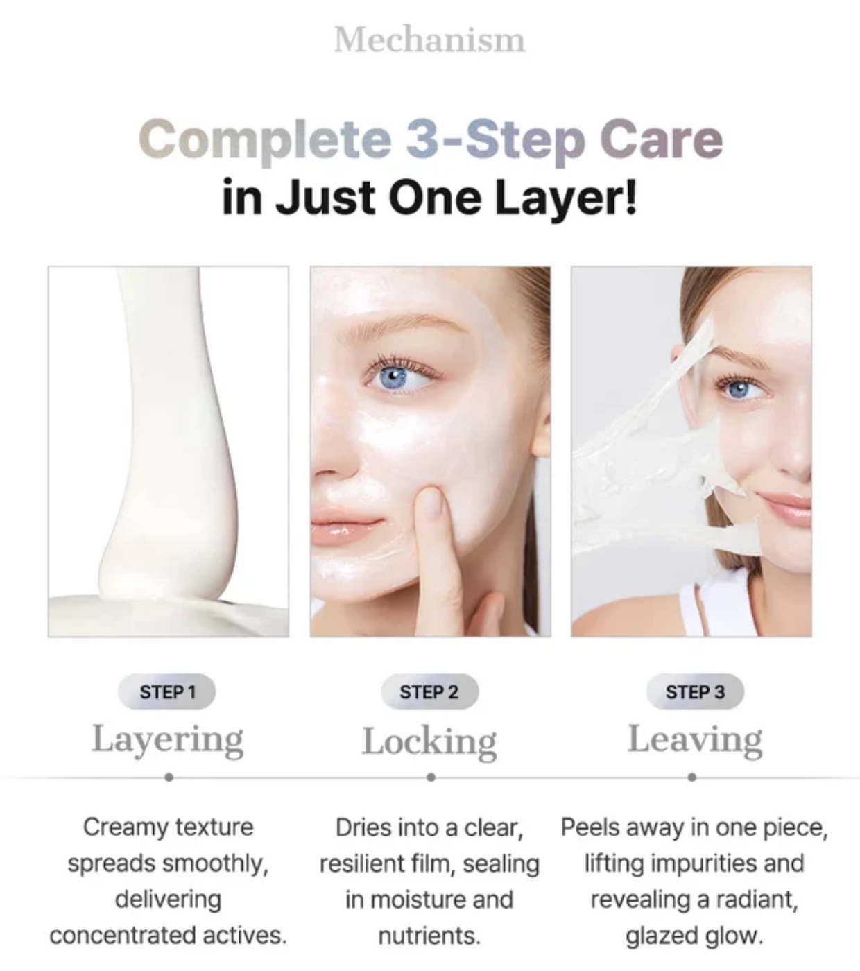 Ao ser aplicado, espalha-se numa camada uniforme que, ao secar, transforma-se numa película transparente removível. Ao ser retirada, a pele fica mais macia, hidratada e visivelmente mais luminosa, sem deixar resíduos pegajosos.