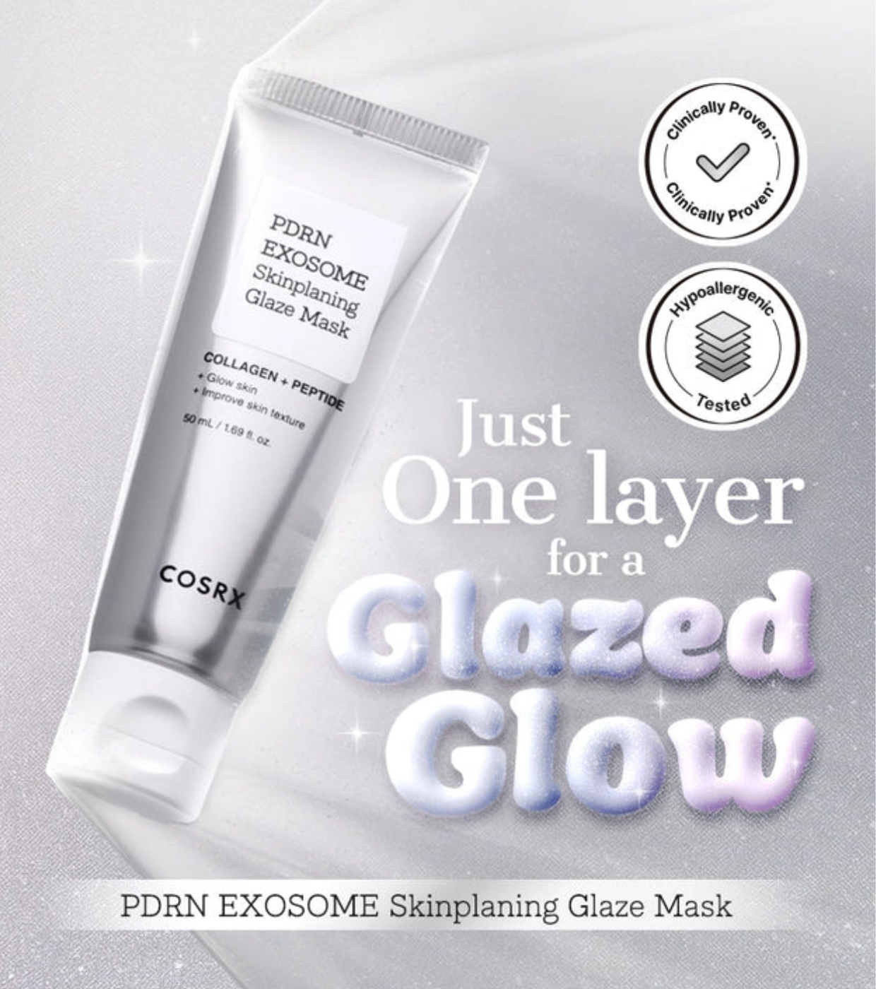 A máscara peel-off PDRN EXOSOME Skinplaning Glaze da COSRX transforma a pele opaca em uma pele viçosa, firme e luminosa desde a primeira aplicação.