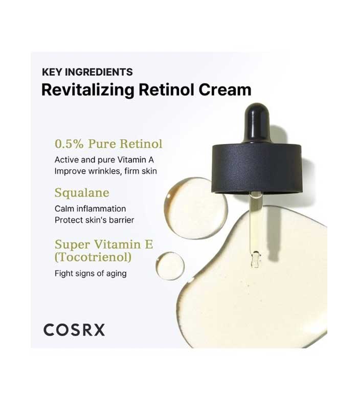 Contém 0,5% de retinol, um ingrediente ativo funcional antienvelhecimento que ajuda a reduzir a profundidade das rugas e outras manchas na pele envelhecida, promovendo a produção natural de colágeno e a renovação celular.