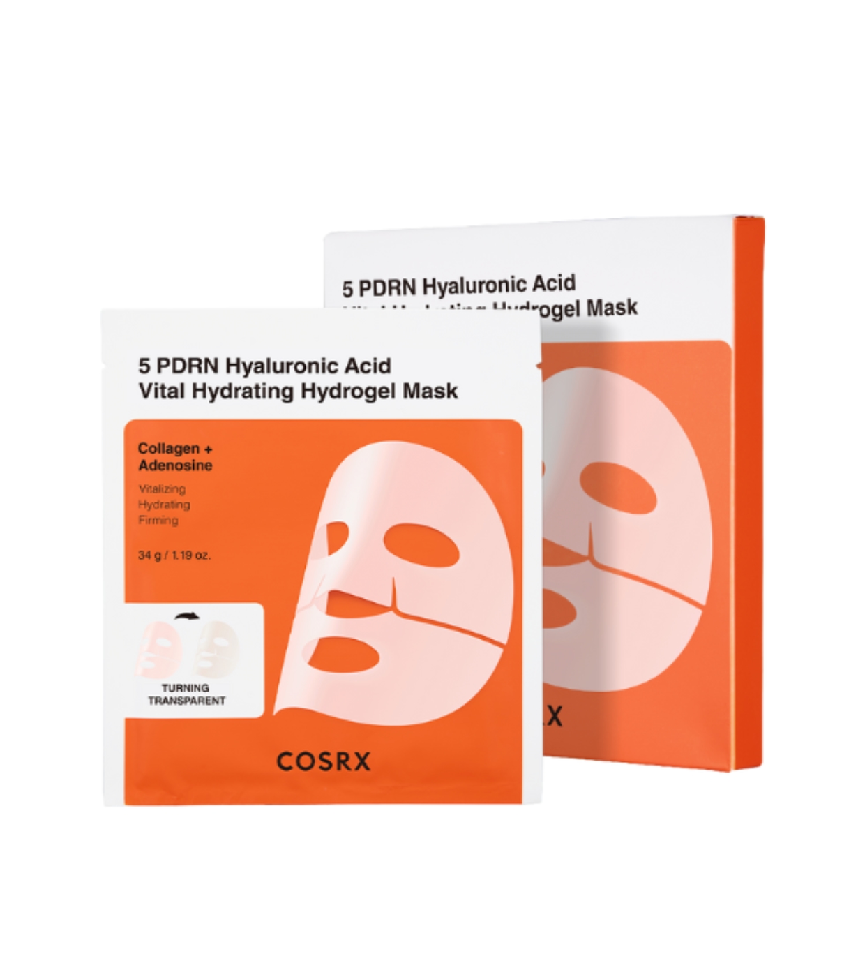 A máscara 5 PDRN Hyaluronic Acid Vital da COSRX é um hidrogel de hidratação intensiva que se adapta à pele como uma segunda camada, tornando-se transparente à medida que libera seus ingredientes ativos.