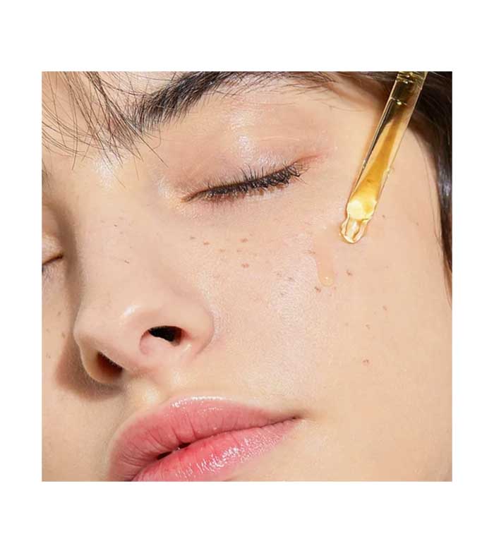 Agite suavemente o frasco de um lado para o outro uma ou duas vezes e aplique algumas gotas na pele limpa. Em seguida, massageie suavemente o soro, começando por dentro do rosto.