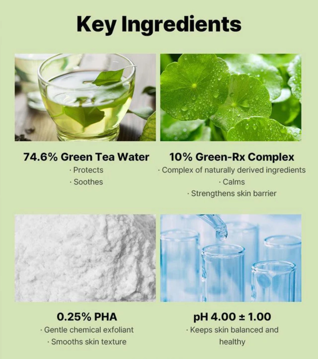 CAMELLIA SINENSIS LEAF WATER, BUTYLENE GLYCOL, TARAXACUM OFFICINALE LEAF EXTRACT, CENTELLA ASIATICA EXTRACT, HAMAMELIS VIRGINIANA LEAF EXTRACT, MELALEUCA ALTERNIFOLIA LEAF EXTRACT, ARTEMISIA PRINCEPS EXTRACT, 1,2-HEXANEDIOL, CASSIA OBTUSIFOLIA SEED EXTRACT, LACTOBIONIC ACID, MALTODEXTRIN, PANTHENOL, POLYGLYCERYL-10 LAURATE, POLYGLYCERYL-10 MYRISTATE, GLYCERIN, ARGININE, ALLANTOIN, ASIATICOSIDE, ASIATIC ACID, MADECASSIC ACID, SODIUM HYALURONATE, GARDENIA FLORIDA FRUIT EXTRACT, CITRUS AURANTIUM BERGAMIA FRUIT OIL, MENTHYL LACTATE, MENTHA HAPLOCALIX EXTRACT