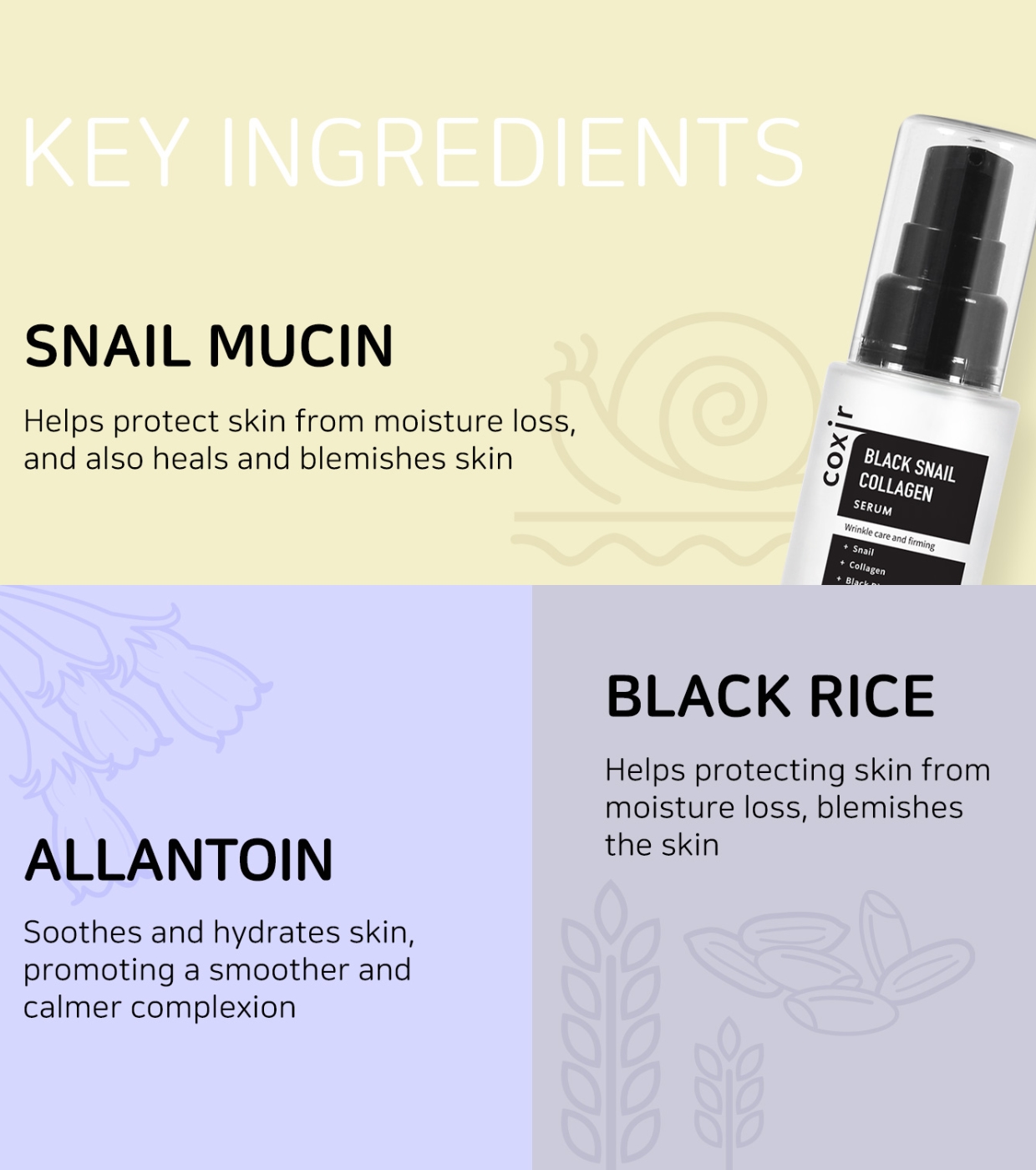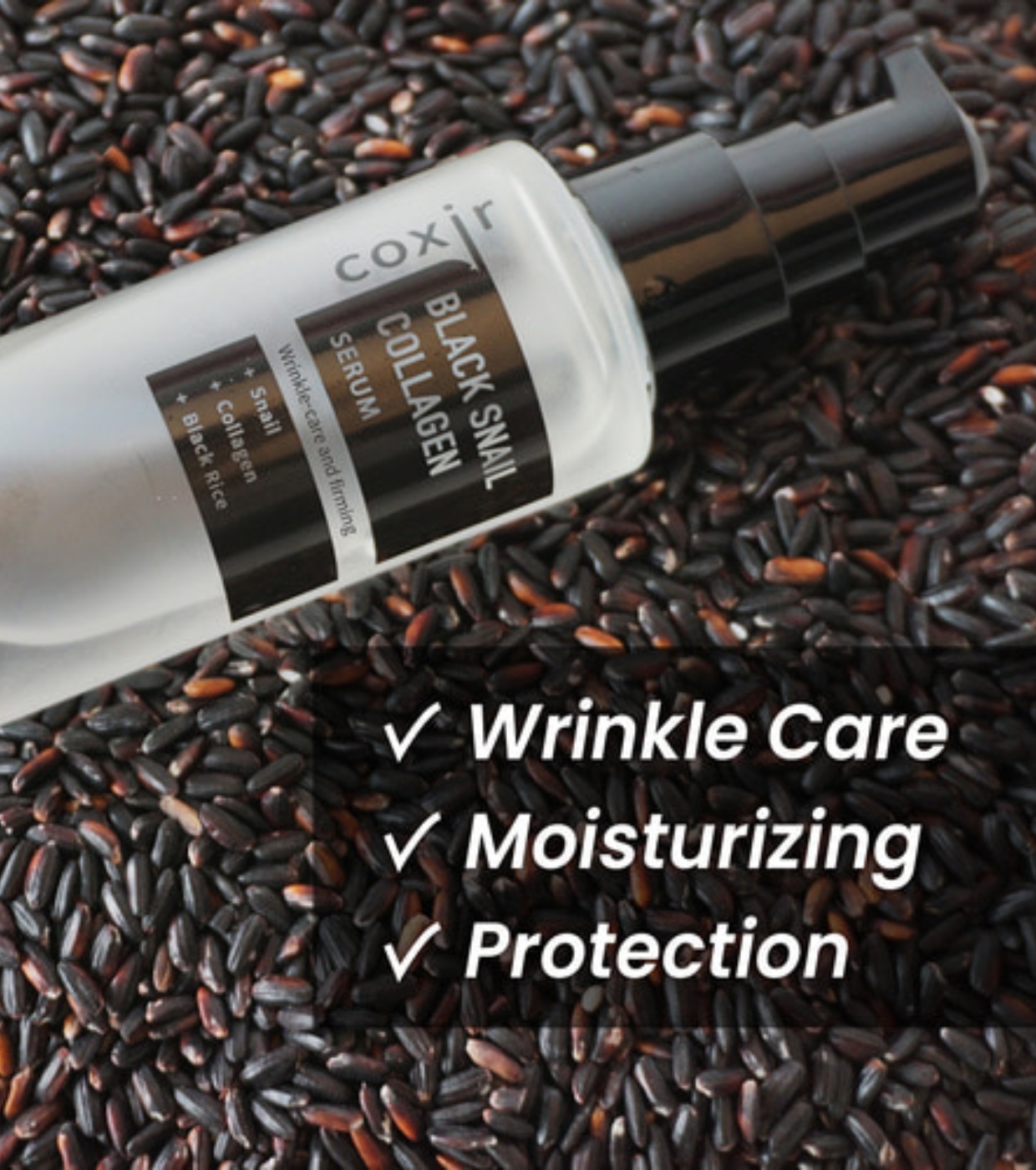 O soro COXIR COXIR combina uma poderosa mistura de limo de caracol, colágeno e ingredientes ricos em antioxidantes, como feijão preto, gergelim preto e arroz preto, para oferecer um cuidado completo da pele.