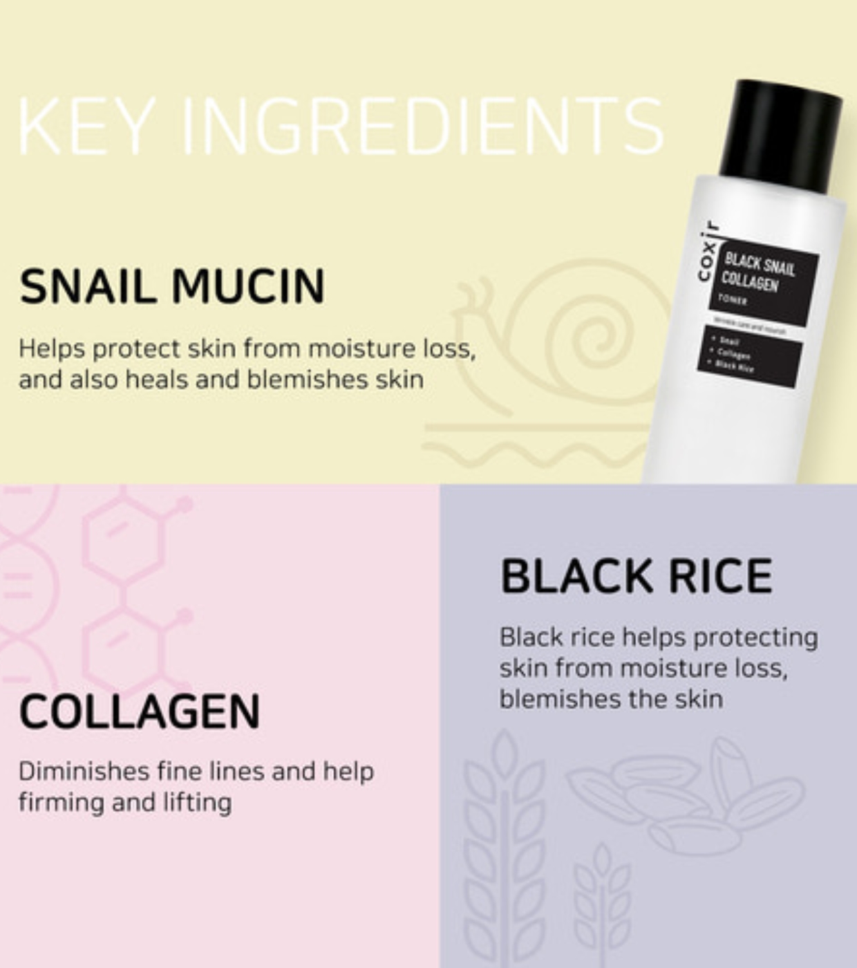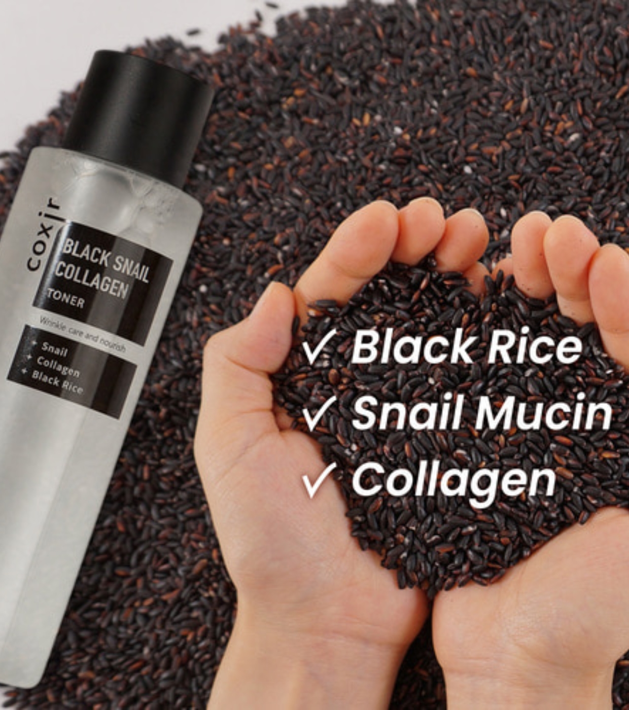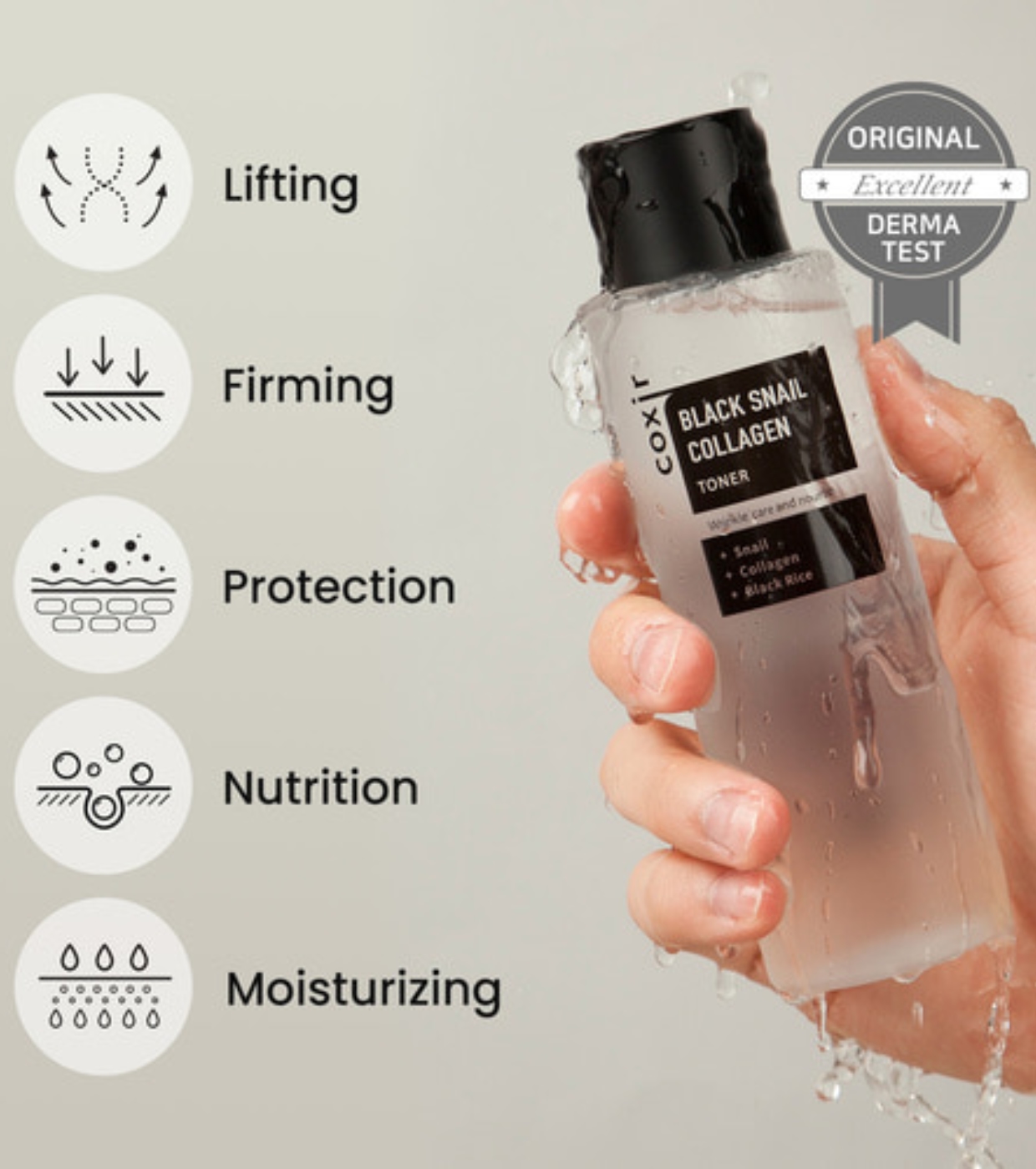 Este toner Black Snail Collagen da COXIR é a solução perfeita para equilibrar e melhorar a textura da pele, revelando uma tez luminosa, suave e saudável.