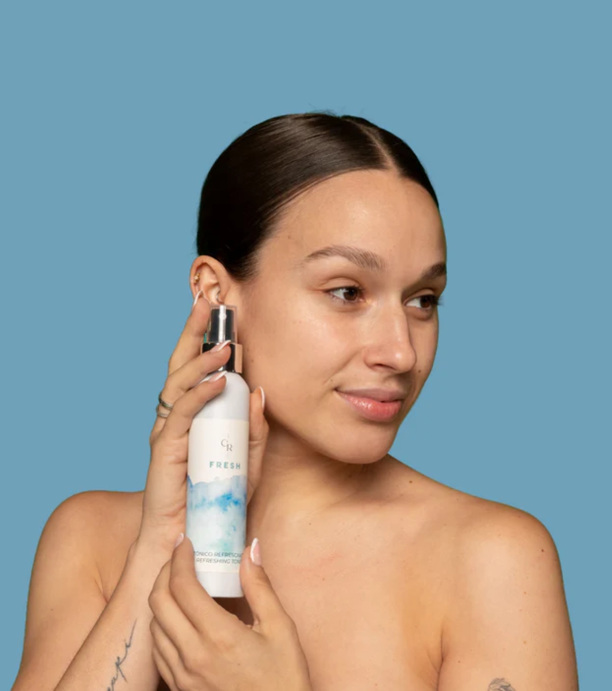Borrife o tônico suavemente no rosto e pescoço.