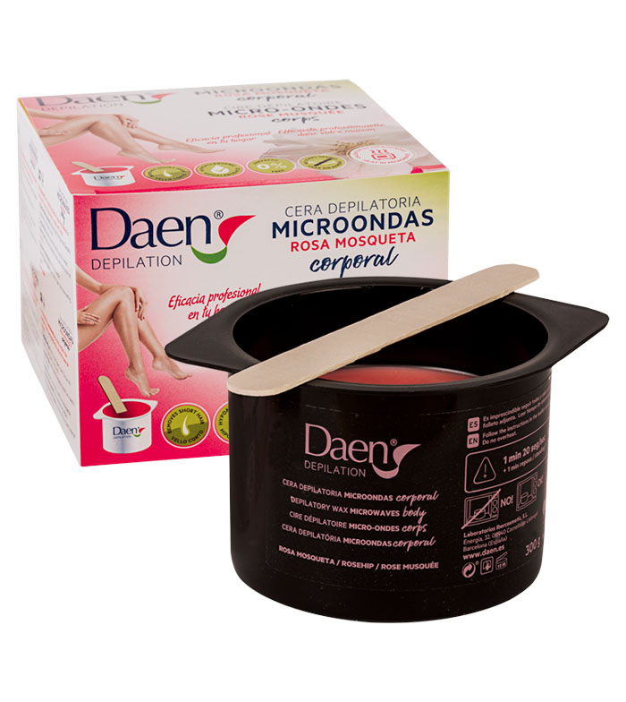 Cera depilatória profissional para micro-ondas de rosa mosqueta da Daen, com ingredientes naturais à base de resinas.