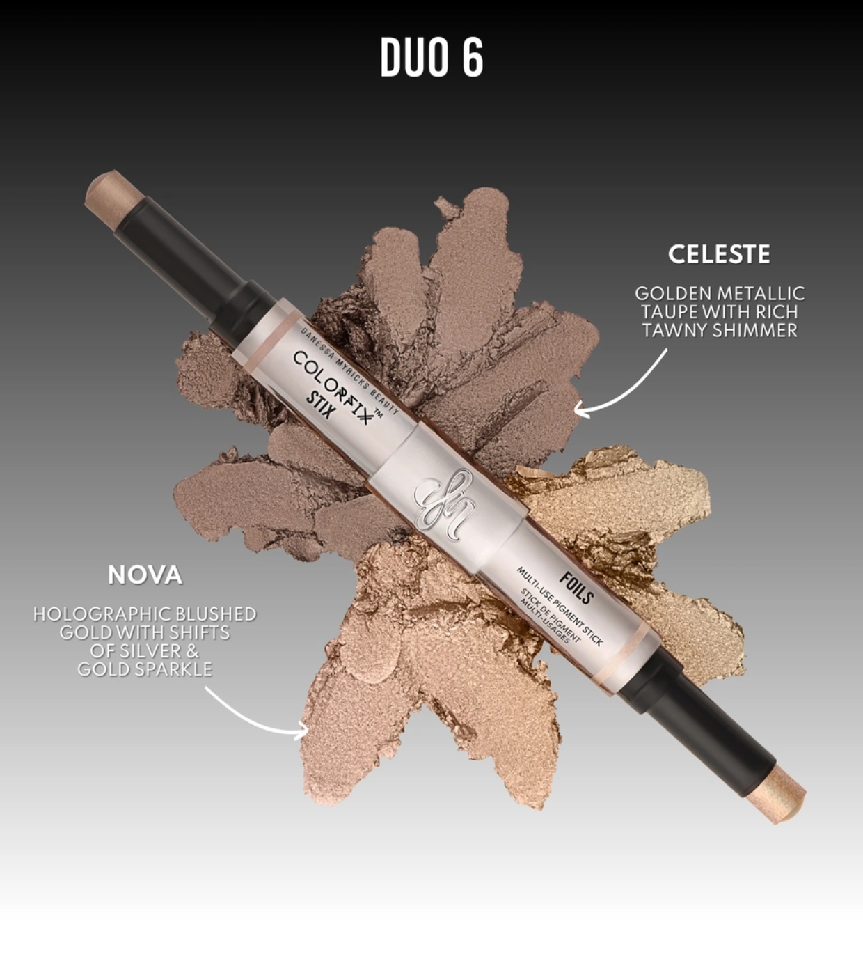 Descubra o Colorfix Stick Duo da Danessa Myricks com textura perolada e efeito refrescante ao contato, perfeito para aplicar nos olhos, bochechas e lábios.