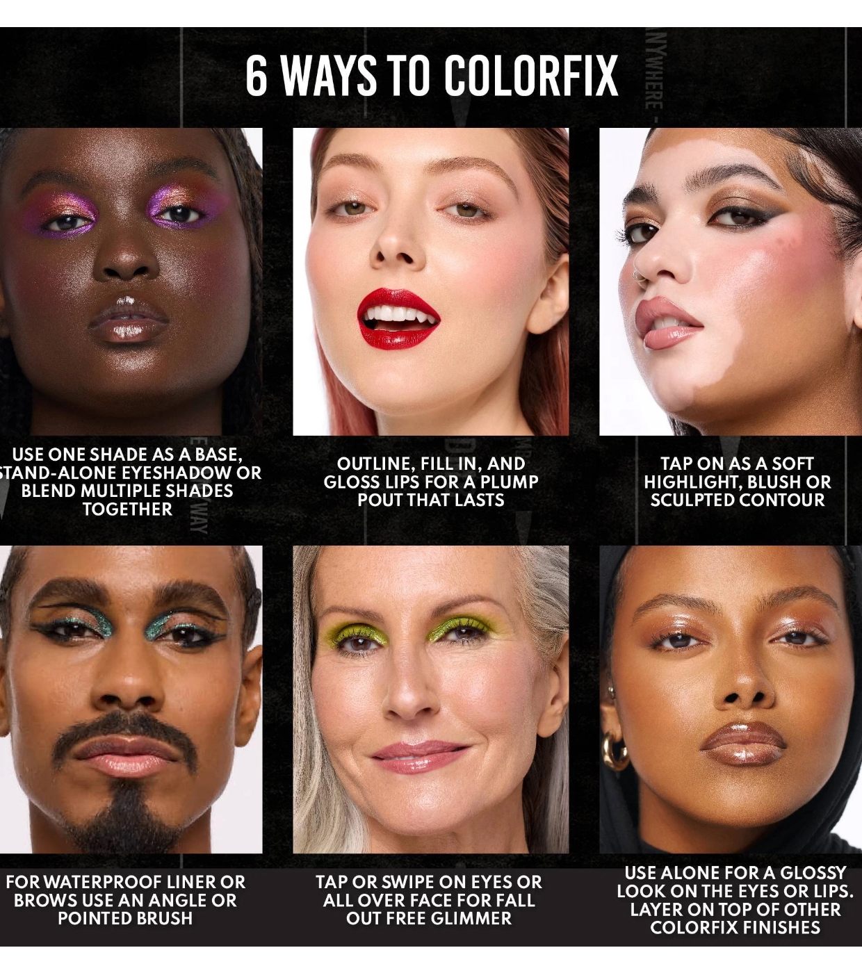 Eles podem ser misturados para criar cores personalizadas, transparências ou saturações em negrito. Colorfix são ideais para serem usados sozinhos ou como base para produtos em pó. Colorfix possui resistência excepcional para suportar altas temperaturas e sua fórmula também é à prova d'água.