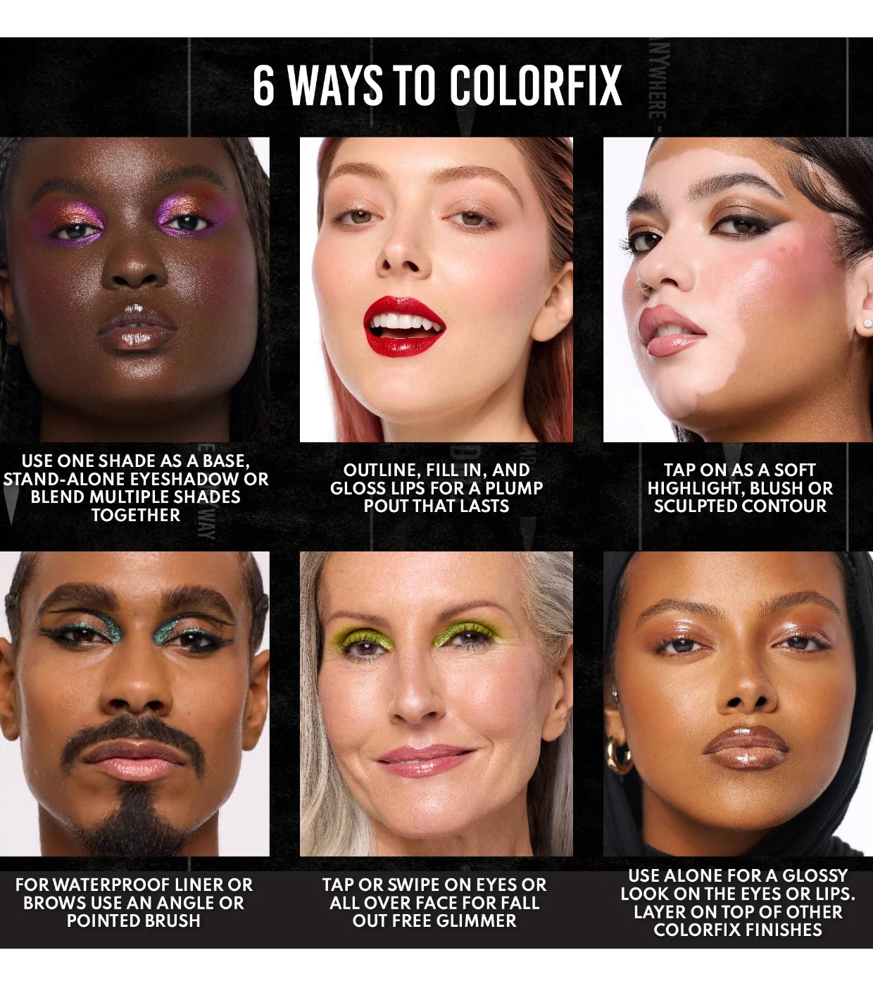 A linha nude lhe dará a oportunidade de usar ColorFix sem esforço para contornar, para criar uma base de sombra natural, como corretivo, para cobrir as sobrancelhas, para um efeito de lábios nude e muito mais.