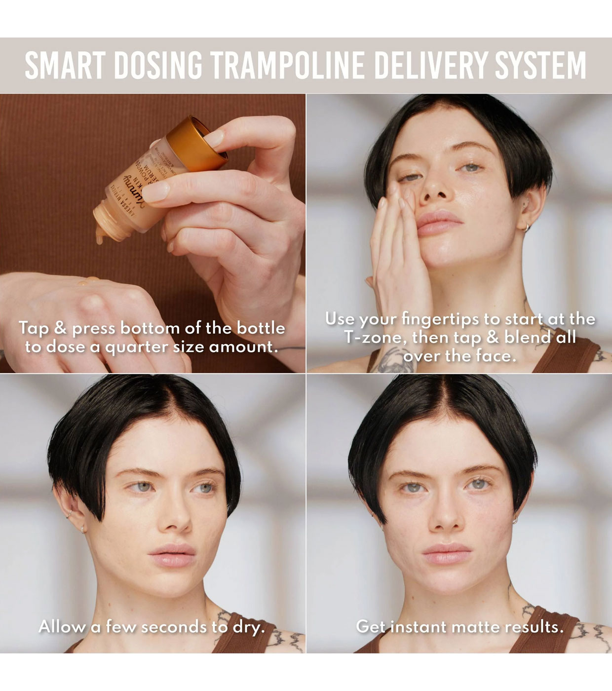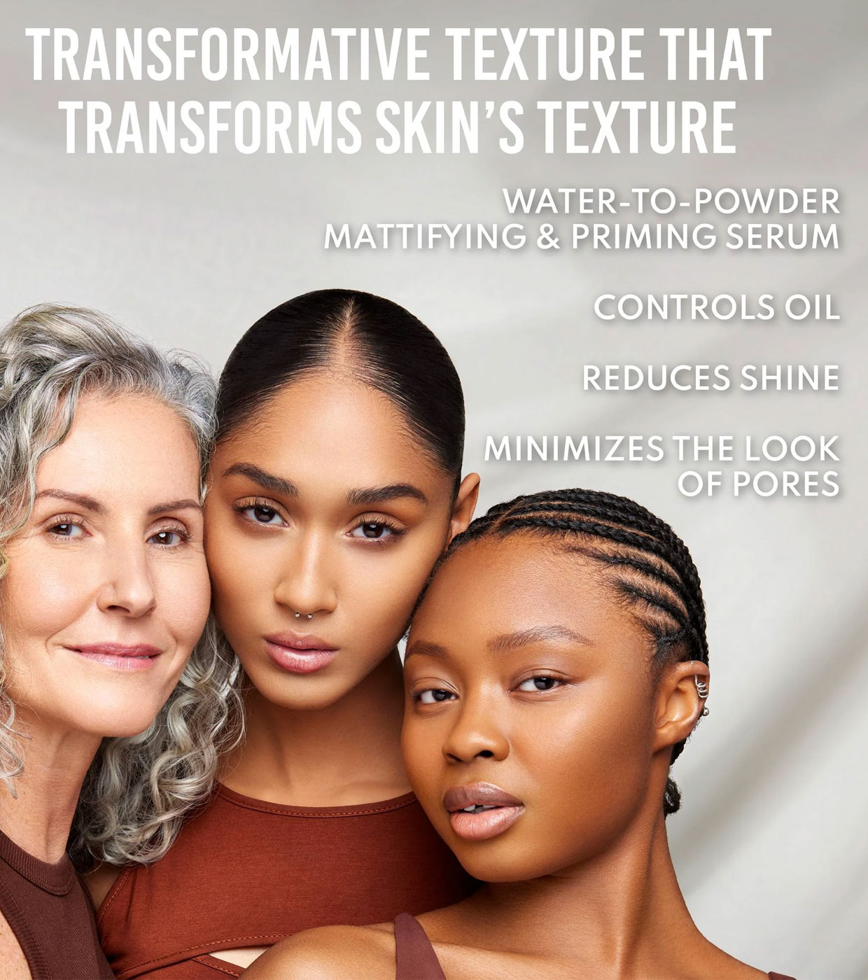 A sua textura leve transforma-se de uma sensação aquosa num acabamento mate em pó, reduzindo instantaneamente o brilho e equilibrando a oleosidade ao longo do dia.