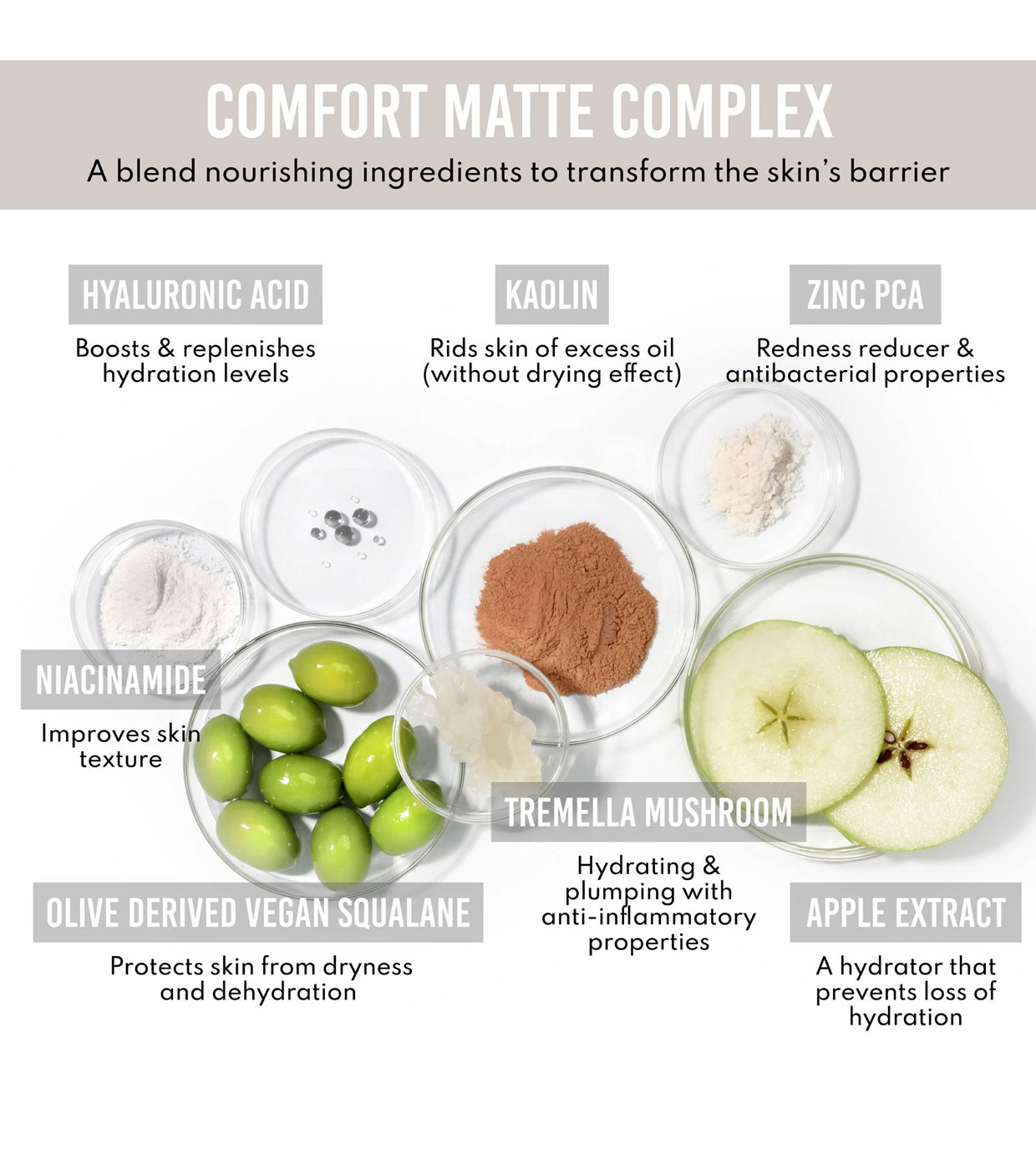 Este sérum matificante multiação é o seu aliado para controlar o brilho, refinar e suavizar a pele, graças ao Complexo Comfort Matte, uma mistura única de sete poderosos ingredientes equilibrantes.