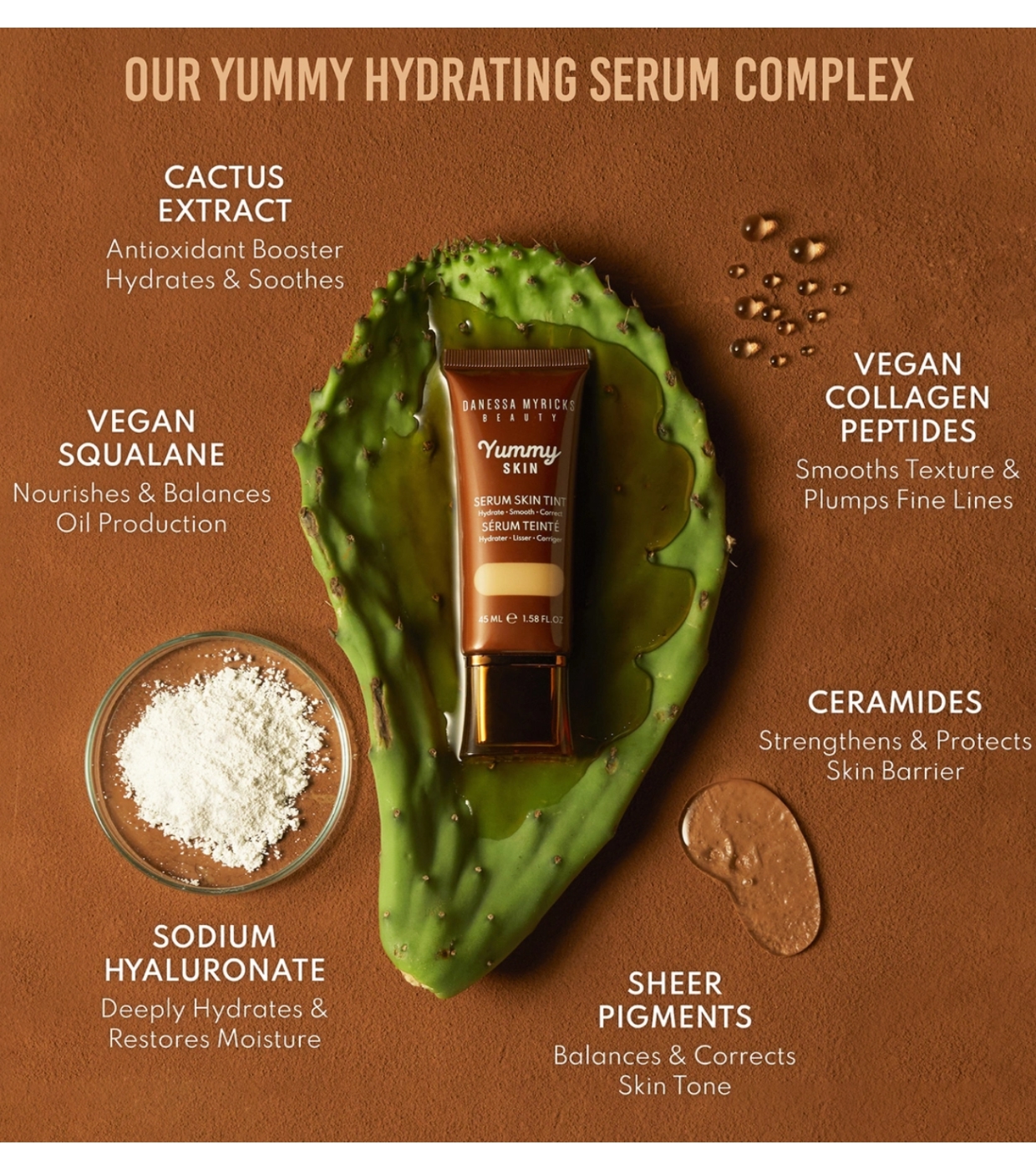 O soro é uma combinação de ingredientes corretores, hidratantes e suavizantes com Hialuronato de Sódio para hidratar profundamente e restaurar a umidade, Peptídeos de Colágeno Vegano para suavizar a textura e preencher linhas finas, Ceramidas para fortalecer, reparar e proteger a barreira da pele. Extrato de cacto antioxidante para hidratar e suave, esqualano vegano para nutrir e hidratar e pigmentos translúcidos para equilibrar e corrigir o tom da pele.