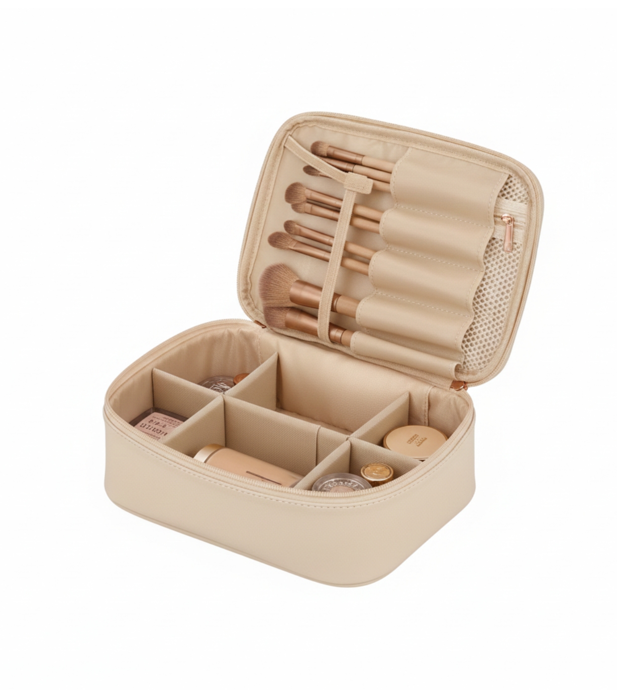 Seu elegante tom bege neutro e sua estrutura firme fazem dele o aliado ideal para proteger e organizar seus itens de beleza essenciais com estilo.