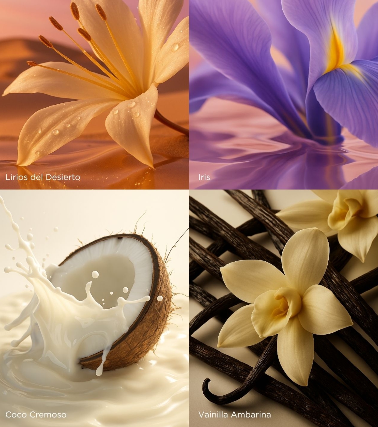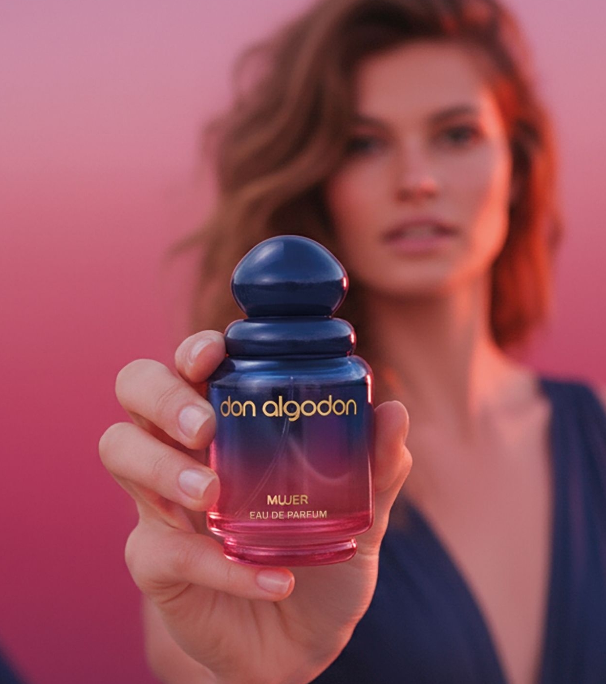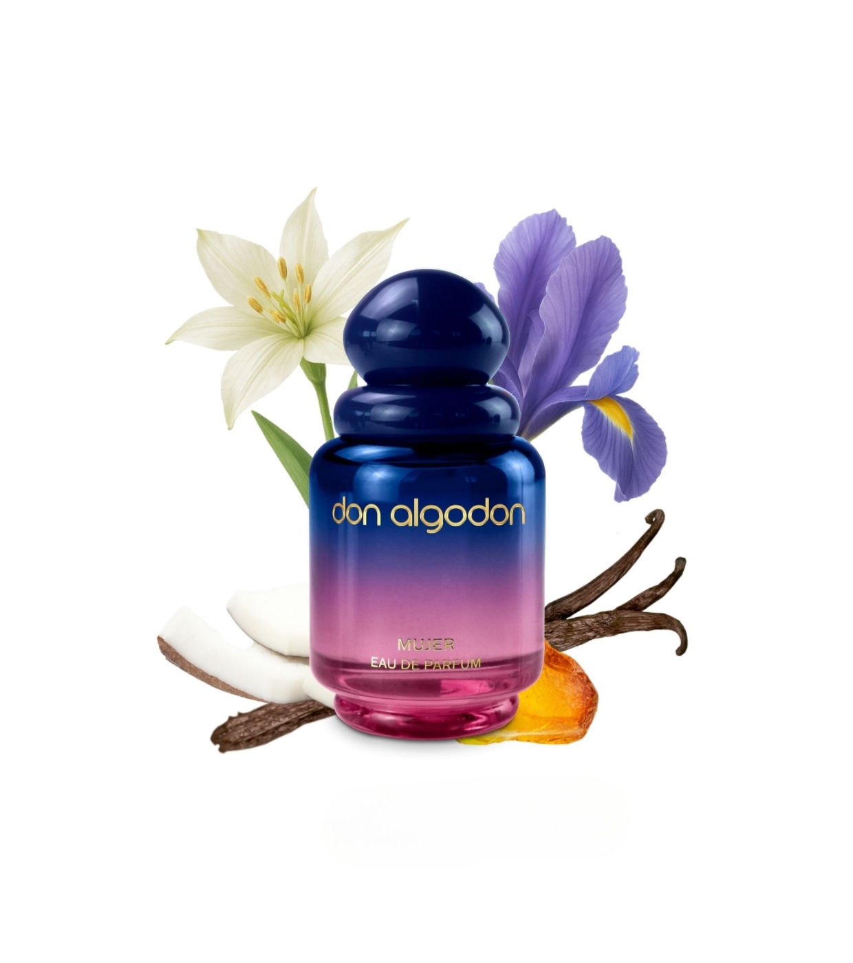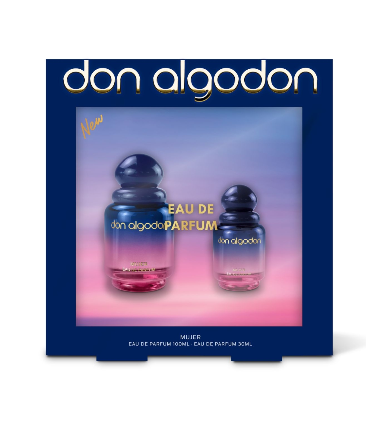 Descubra o conjunto Eau de parfum 100ml + 30ml Mujer da Don Algodón, uma fragrância que desabrocha com força e delicadeza, como uma flor no deserto.