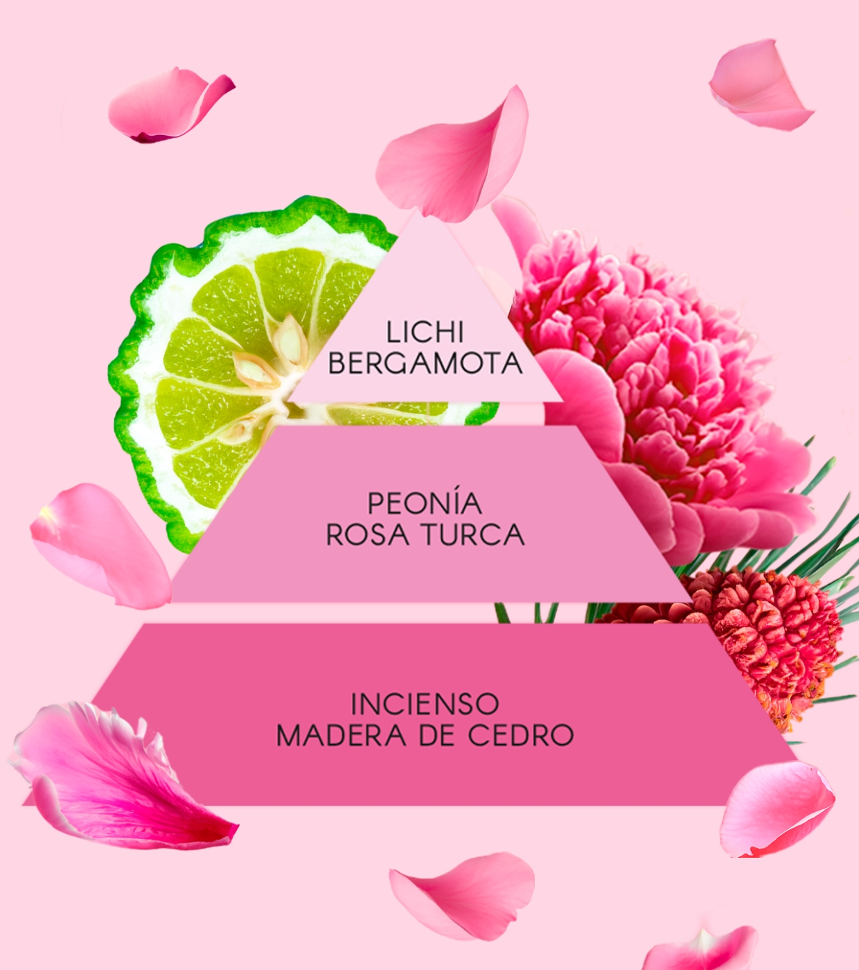 Esta fragrância de 30 ml mistura o frescor da lichia e da bergamota com a delicadeza da peônia e da rosa turca, sobre um fundo sensual de incenso e madeira de cedro.