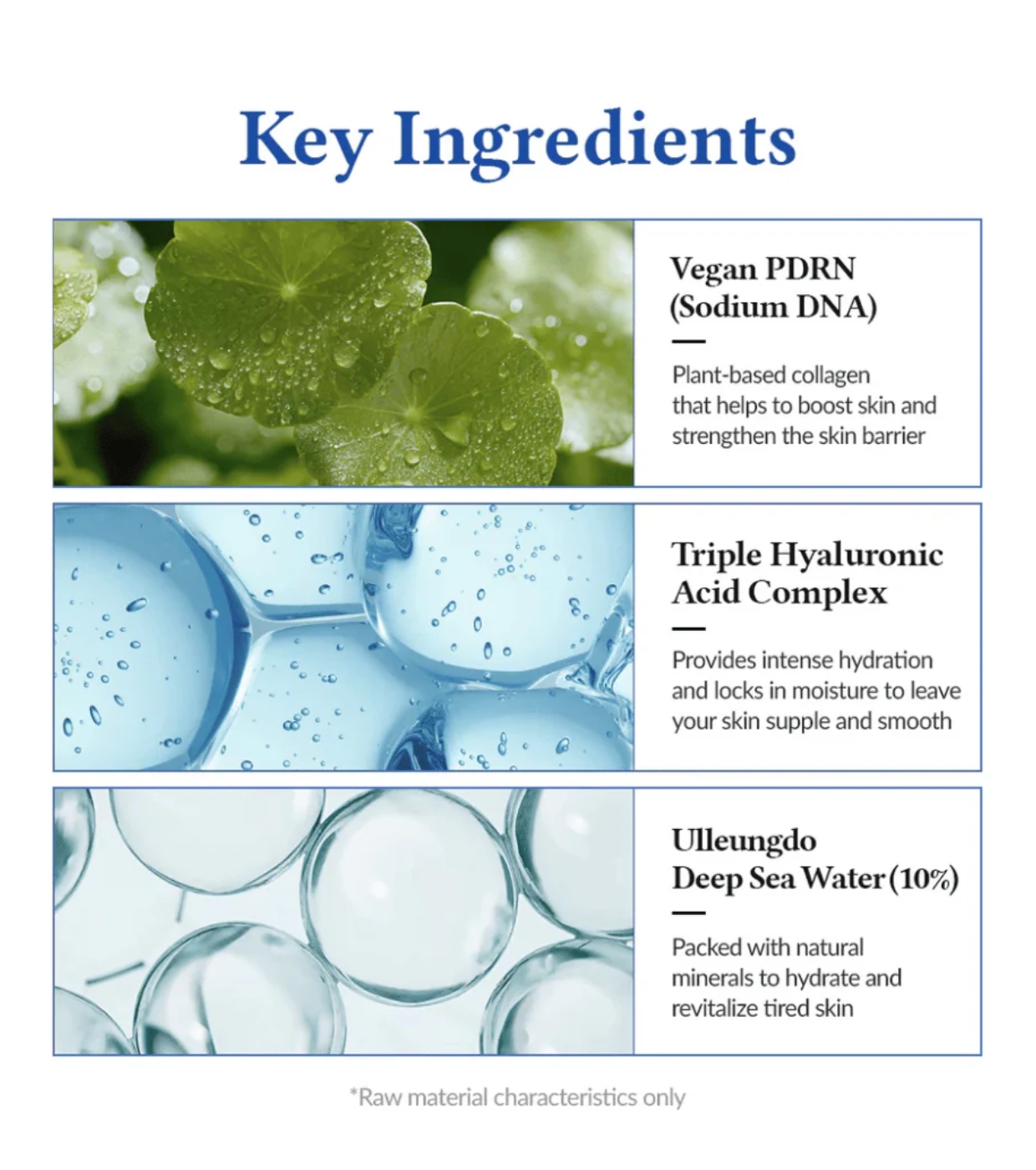 Sua fórmula contém PDRN derivado de plantas, água do mar profunda de Ulleungdo (10%) e um complexo triplo de ácido hialurônico que ajuda a preencher, suavizar e manter a hidratação em diferentes camadas da pele.