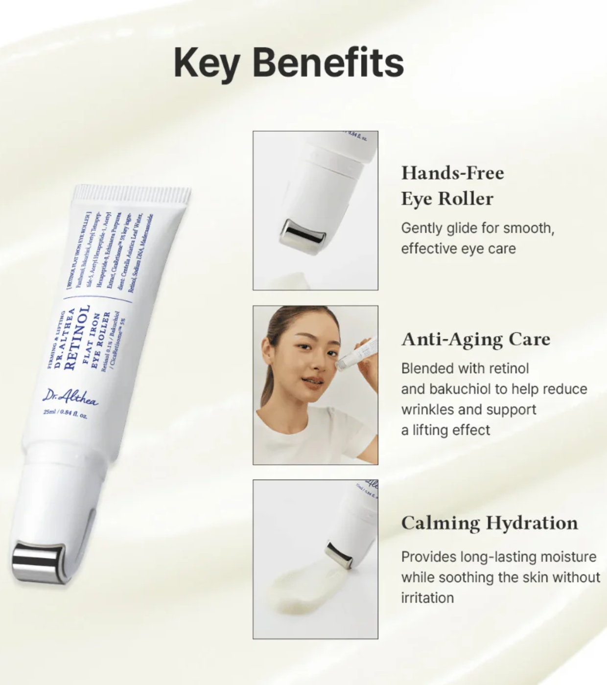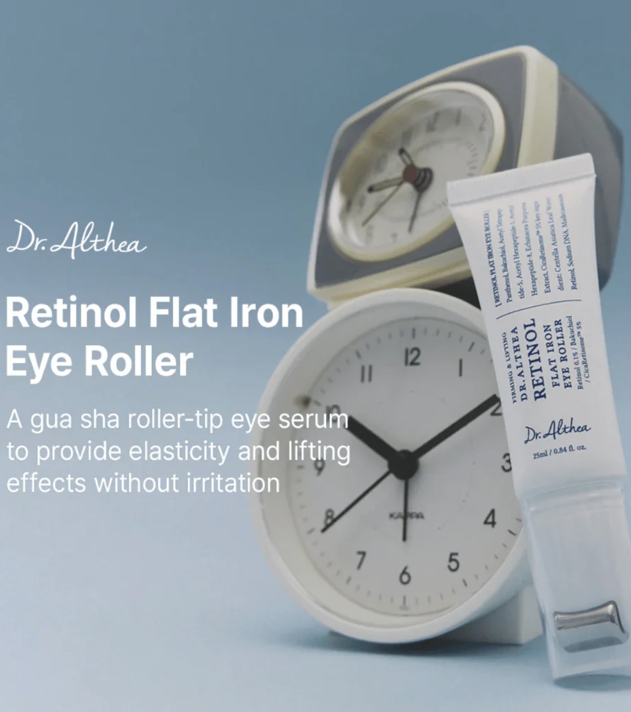 O Retinol Flat Iron Eye Roller da Dr. Althea é um tratamento específico para o contorno dos olhos que combina ativos antienvelhecimento e calmantes para melhorar a firmeza, suavizar rugas e proporcionar hidratação a uma área particularmente delicada.