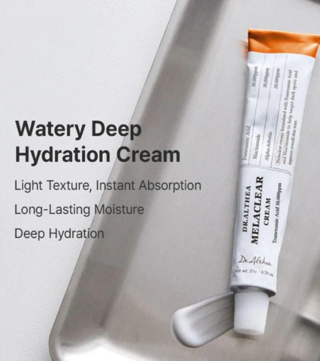 Aqua (Water), Butylene Glycol, Glycerin, Niacinamide, Tranexamic Acid, 1,2-Hexanediol, Alpha-Arbutin, Coco-Caprylate/Caprate, Diethoxyethyl Succinate, Hydroxyethyl Urea, Ammonium Acryloyldimethyltaurate/VP Copolymer, Propanediol, Acrylates/C10-30 Alkyl Acrylate Crosspolymer, Tromethamine, Caprylic/Capric Triglyceride, Ethylhexylglycerin, Adenosine, Lithospermum Erythrorhizon Root Extract, Hydrolyzed Gardenia Florida Extract, Hydrolyzed Malt Extract, Hydrolyzed Viola Tricolor Extract, Sodium Hyaluronate, Hyaluronic Acid, Hydrolyzed Hyaluronic Acid, Linolenic Acid, Plumeria Rubra Flower Extract, Ceramide NP, Hydrogenated Lecithin, Sodium DNA, Solanum Lycopersicum (Tomato) Fruit Extract.
