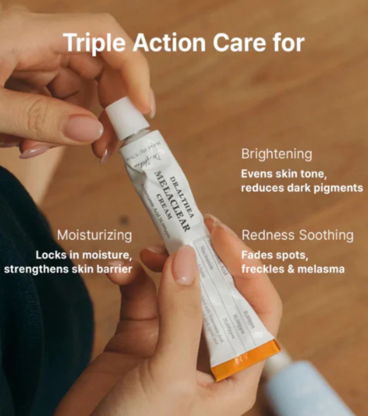 Sua fórmula combina um poderoso sistema anti-melanina de tripla ação, que age diretamente no excesso de pigmentação enquanto hidrata e acalma a pele.