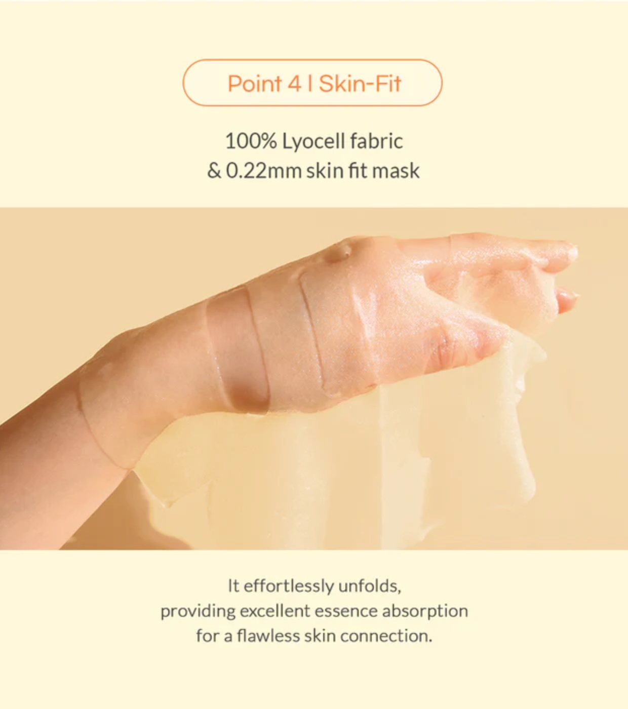 Seu tecido 100% Lyocell, fino mas resistente, adapta-se perfeitamente ao rosto para uma absorção profunda da essência.