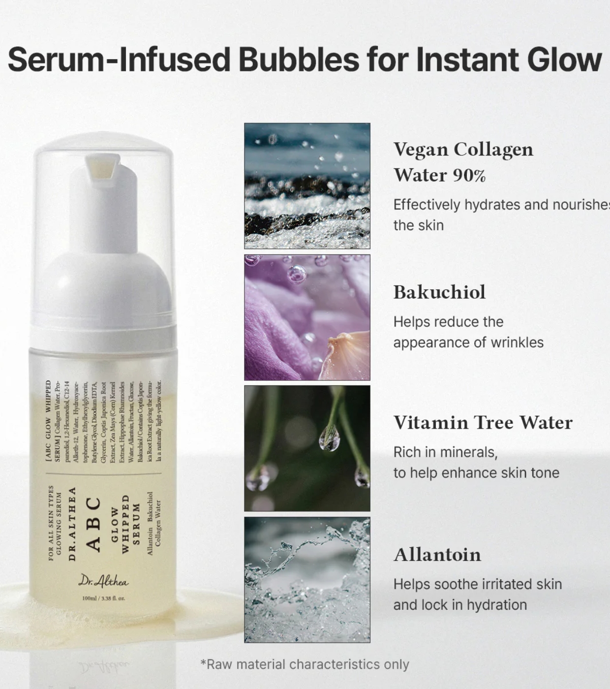 Formulado com 90% de colágeno vegano, água, bakuchiol, água da árvore da vitamina e alantoína: