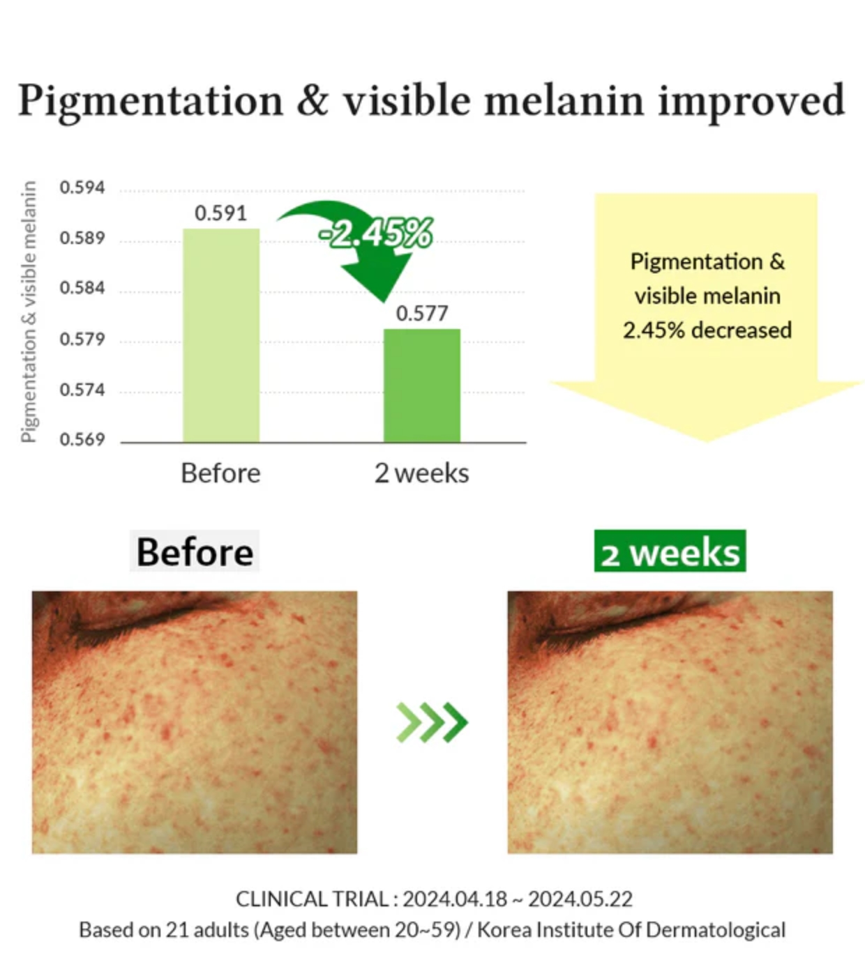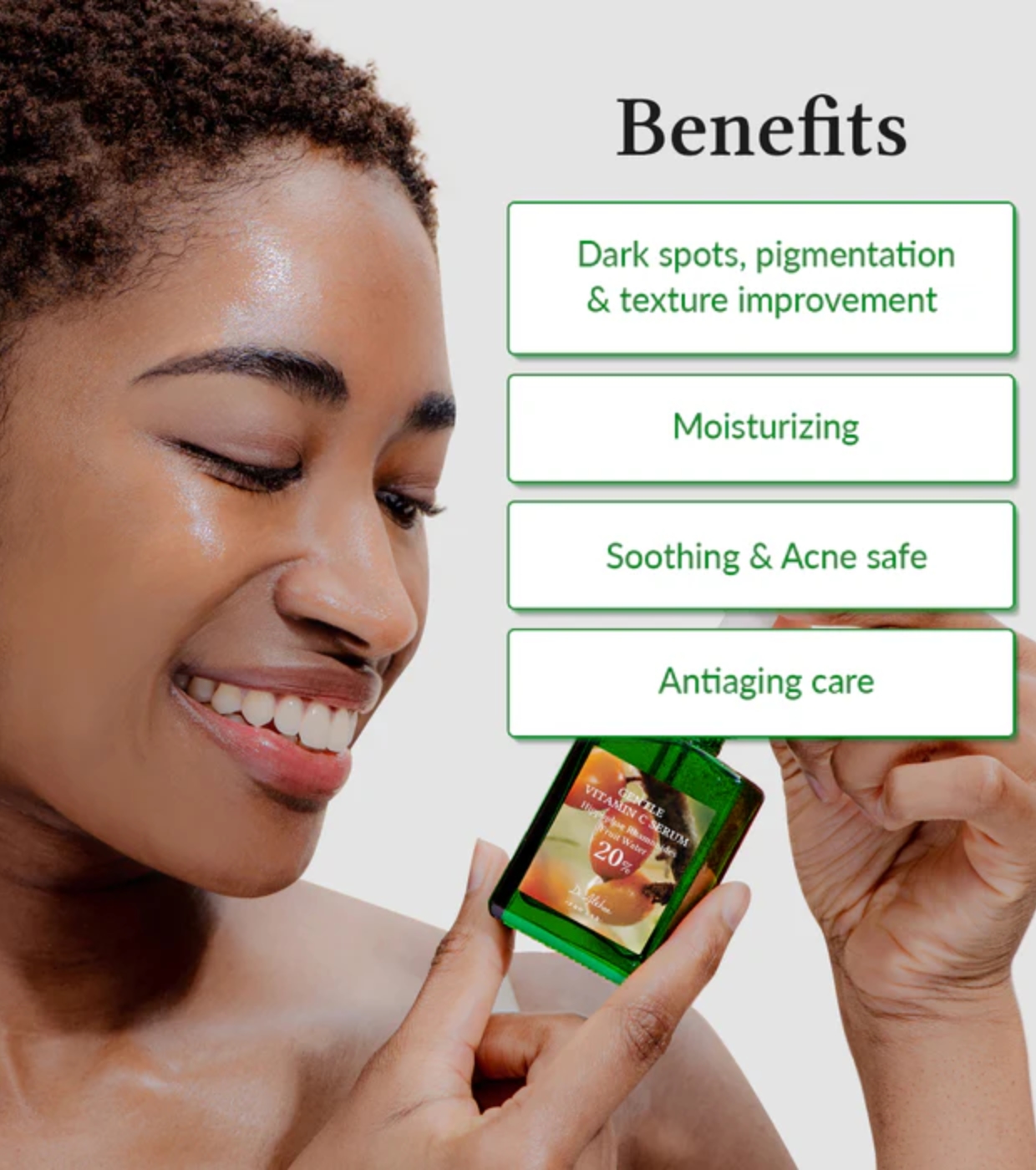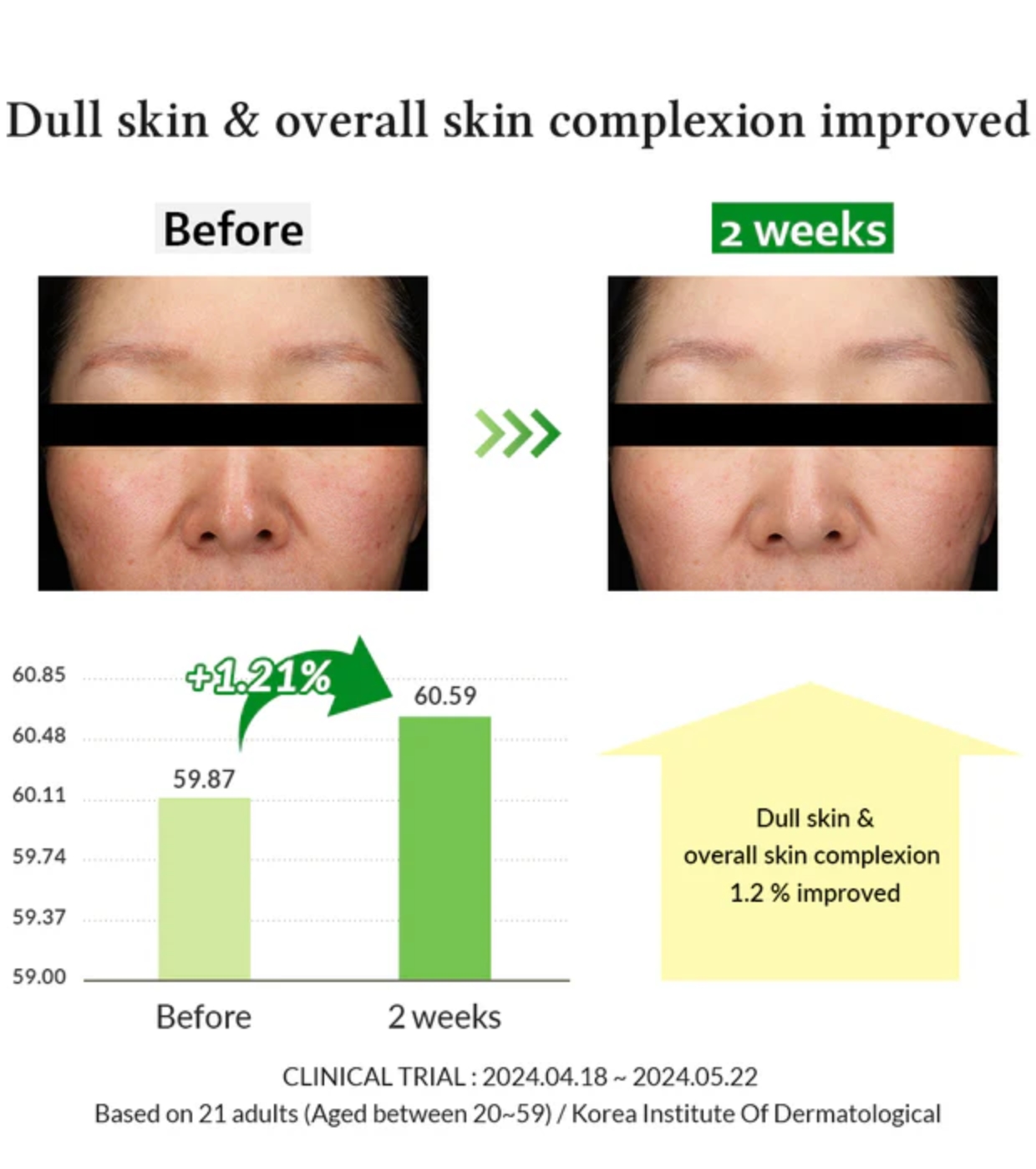 Sua fórmula inteligente combina 5% de niacinamida, 20% de extrato de Hippophae rhamnoides (rico em vitamina C natural) e 2% de água de folhas de chá verde para combater manchas escuras e acalmar a pele sem sobrecarregá-la.