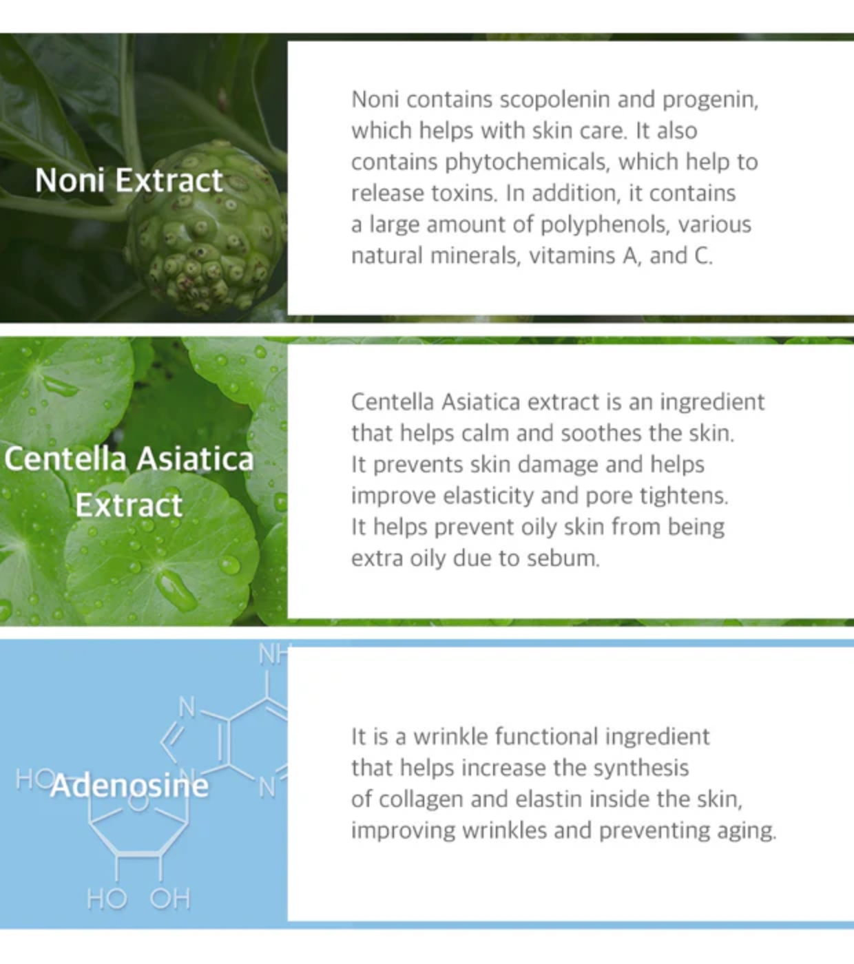 Water, Pentylene Glycol, Butylene Glycol, 1,2-Hexanediol, Niacinamide, Methylpropanediol, Betaine, Centella Asiatica Extract, Morinda Citrifolia Extract, Carbomer,Arginine, Polyglyceryl-10 Laurate, Hydroxyethyl Acrylate/Sodium Acryloyldimethyl Taurate Copolymer, Disodium EDTA, Adenosine, Melia Azadirachta Leaf Extract,Fragrance, Melia Azadirachta Flower Extract, Sorbitan Isostearate, Polysorbate 60, Sodium Hyaluronate, Sodium Hyaluronate Crosspolymer, Hydrolyzed Hyaluronic Acid,Hyaluronic Acid, Hydrolyzed Sodium Hyaluronate