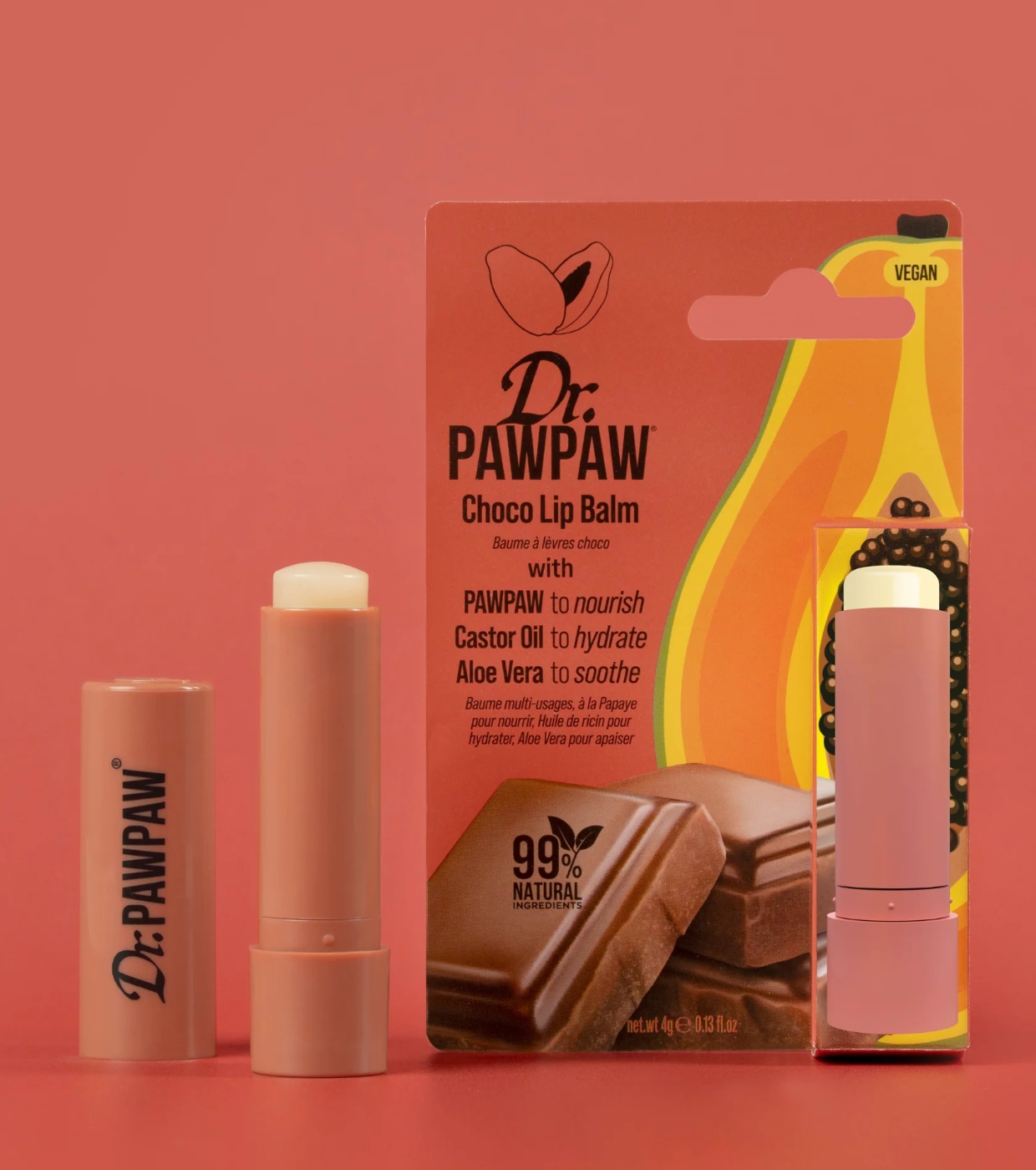 Desfrute de um cuidado labial requintado com o bálsamo labial Dr. PAWPAW Dr. PAWPAW , um bálsamo milagroso vegano e 99% natural, formulado para hidratar profundamente e deixar os lábios macios, nutridos e com um delicioso aroma de chocolate.