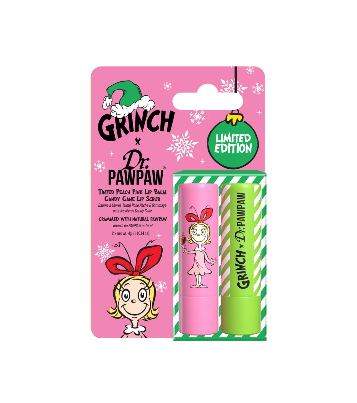Whoville apresenta a dupla mais travessa e deliciosa da temporada: o Grinch x Dr.PAWPAW Whoville Duo, um conjunto essencial que combina cor, esfoliação e hidratação para lábios macios e vibrantes.