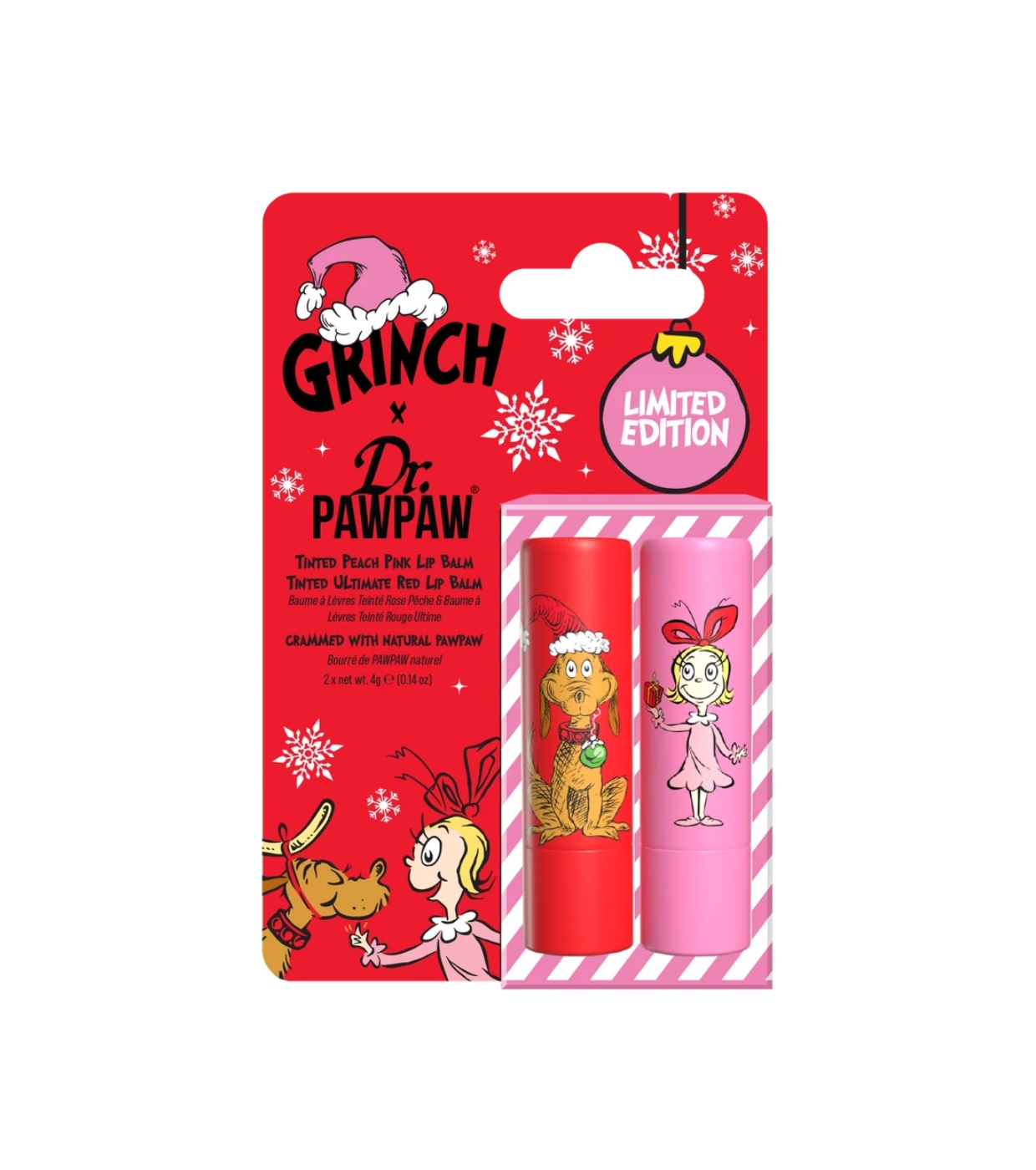 Whoville está mais travessa do que nunca! Descubra o Grinch x Dr.PAWPAW Tinted Duo, uma dupla divertida de bálsamos labiais com cor, criada para hidratar, amaciar e dar um toque festivo de cor aos seus lábios.