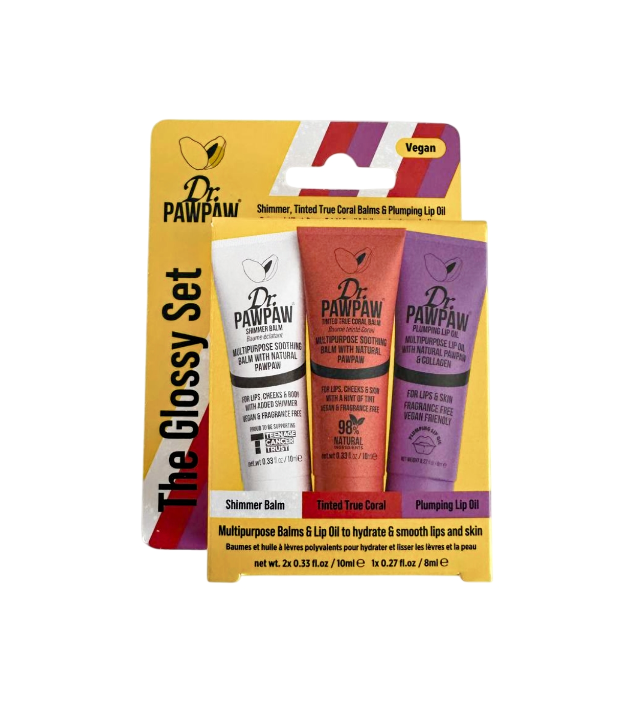 Adicione um toque de brilho e cor à sua rotina com o The Glossy Set do Dr.PAWPAW, uma coleção de protetores labiais e óleos desenvolvidos para hidratar, amaciar e realçar os lábios e a pele com um acabamento luminoso e de aparência saudável.