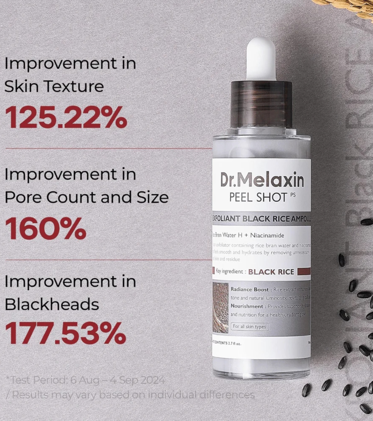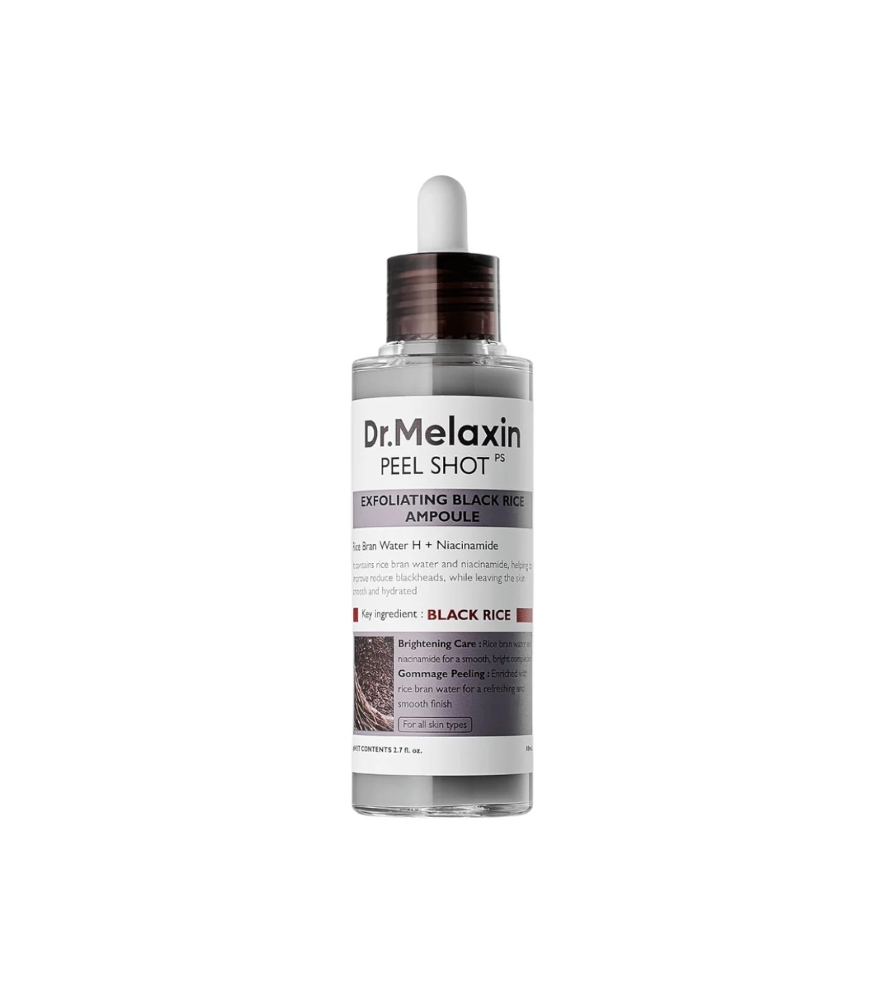 Esta ampola esfoliante Peel Shot Black Rice da Dr.Melaxin foi desenvolvida para oferecer um tratamento completo dos poros, ajudando a remover cravos, regular a oleosidade e melhorar a luminosidade da pele sem comprometer a hidratação.