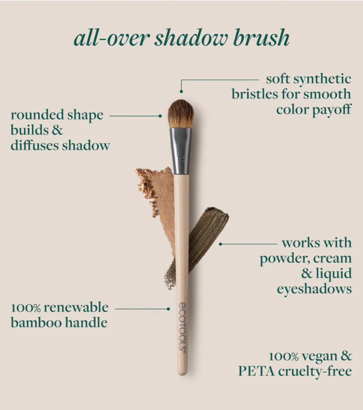 Suas fibras cortadas sob medida são compatíveis com sombras em creme, líquidas, em bastão ou em pó, facilitando a aplicação uniforme e a mistura suave.