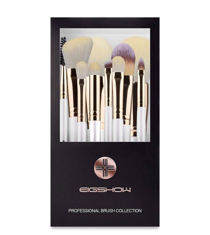 Com pincéis para base, corretivo, pó e sombra.