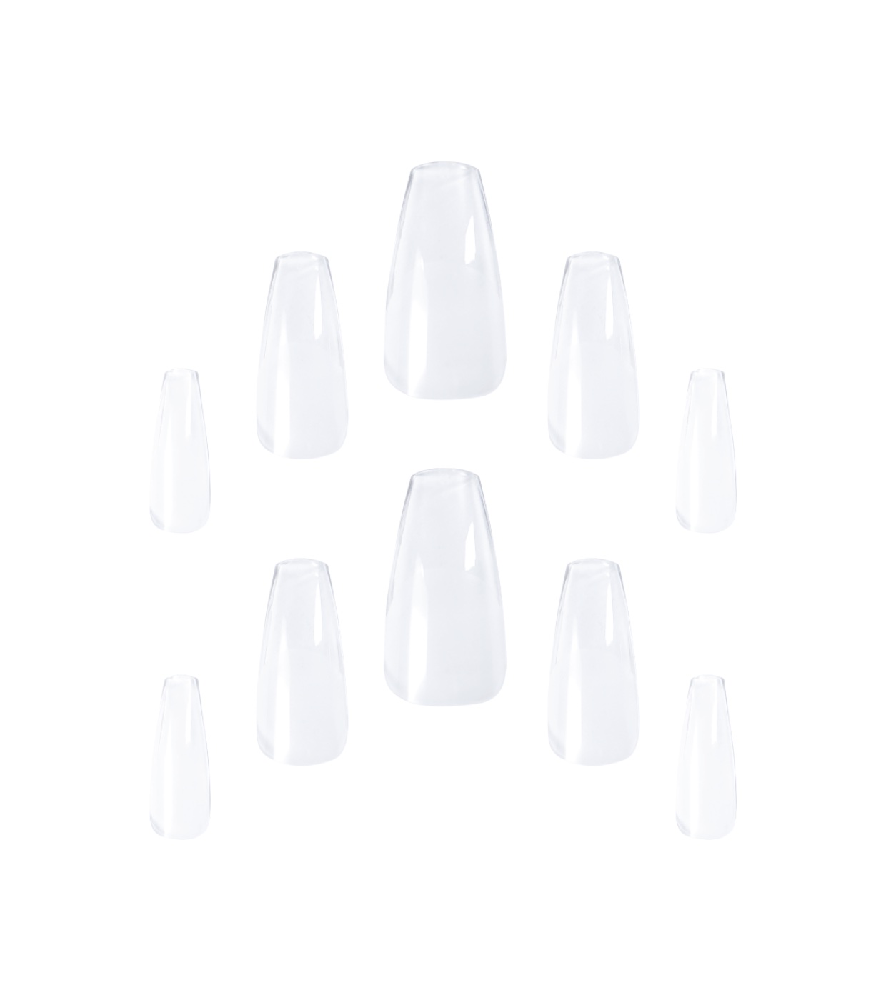 Quer você prefira a flexibilidade da aplicação do gel com luz fotopolimerizável ou a simplicidade da cola, Salon Extensions oferece esse formato de caixão atemporal.