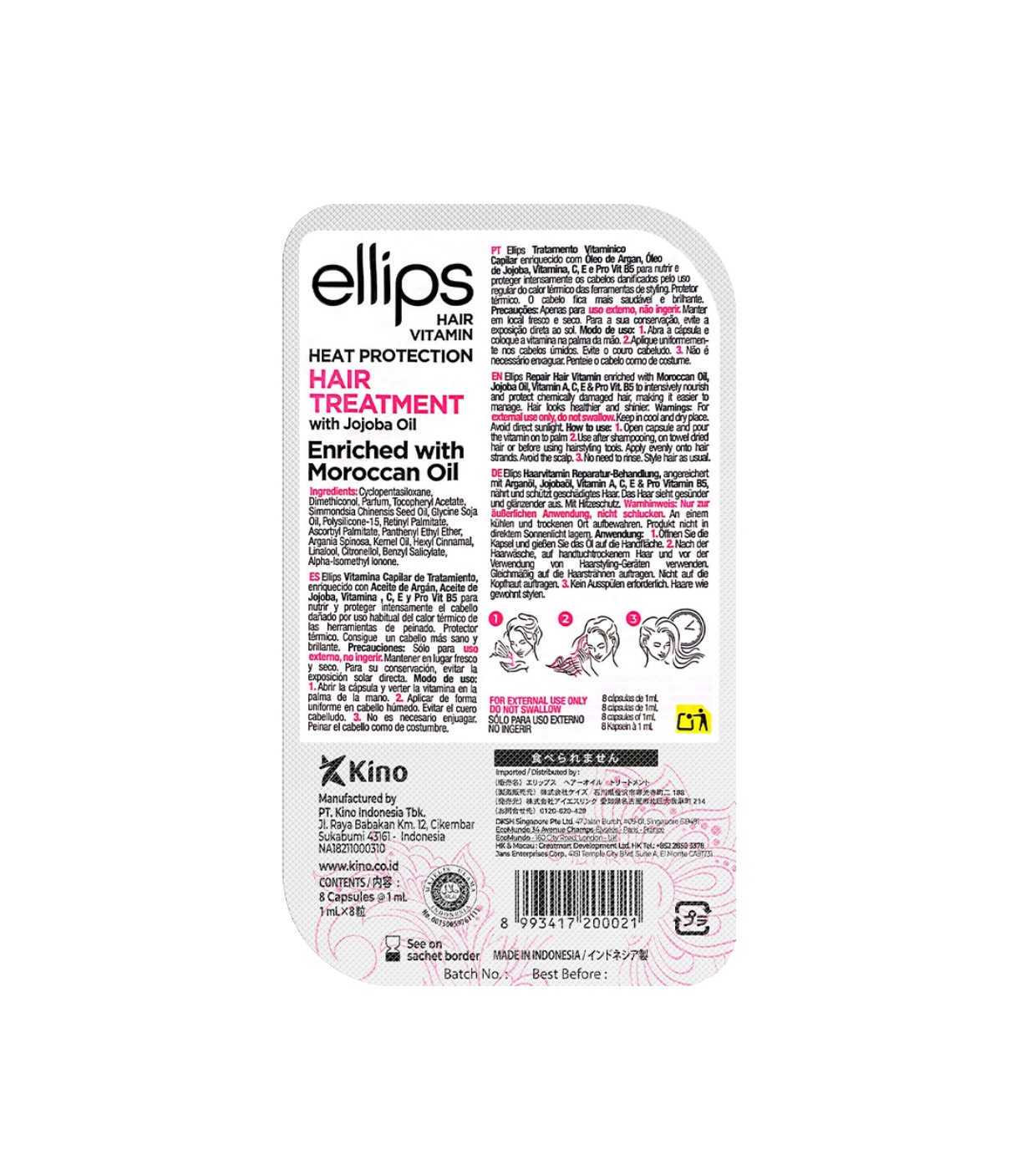 Estas ampolas de soro são enriquecidas com vitamina C, E e B5, óleo de argan e óleo de jojoba. para nutrir e proteger intensamente os cabelos danificados pelo uso regular de ferros ou ferramentas de calor térmico.
