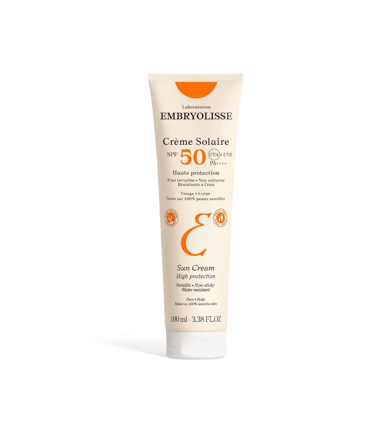 O creme solar Embryolisse SPF50 y PA++++ protege a pele do rosto e corpo de adultos e crianças a partir dos 3 anos, oferecendo elevada proteção contra os raios UVB-UVA, para uma pele protegida, hidratada de forma imediata e duradoura e com um acabamento acetinado invisível, sem marcas brancas e sem pegajosidade.