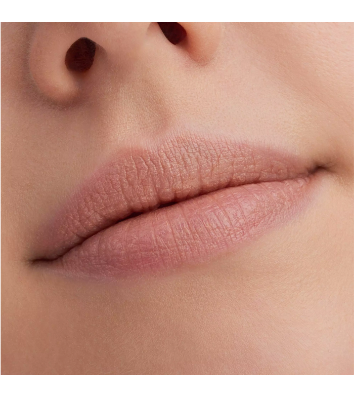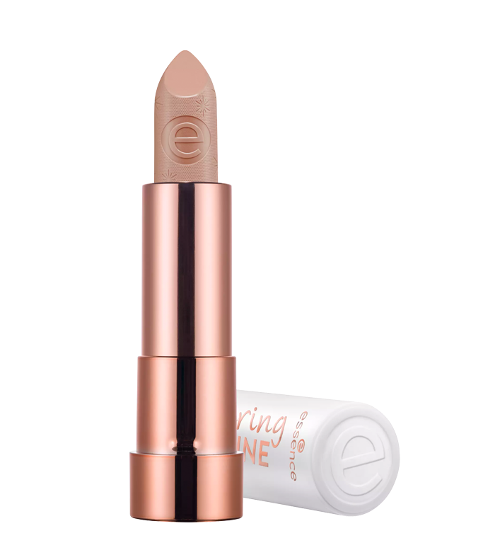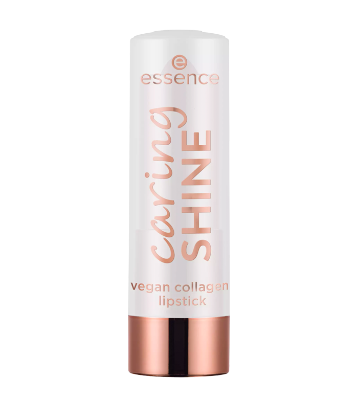 O batom Caring SHINE essence é formulado com colágeno vegano e ácido hialurônico .