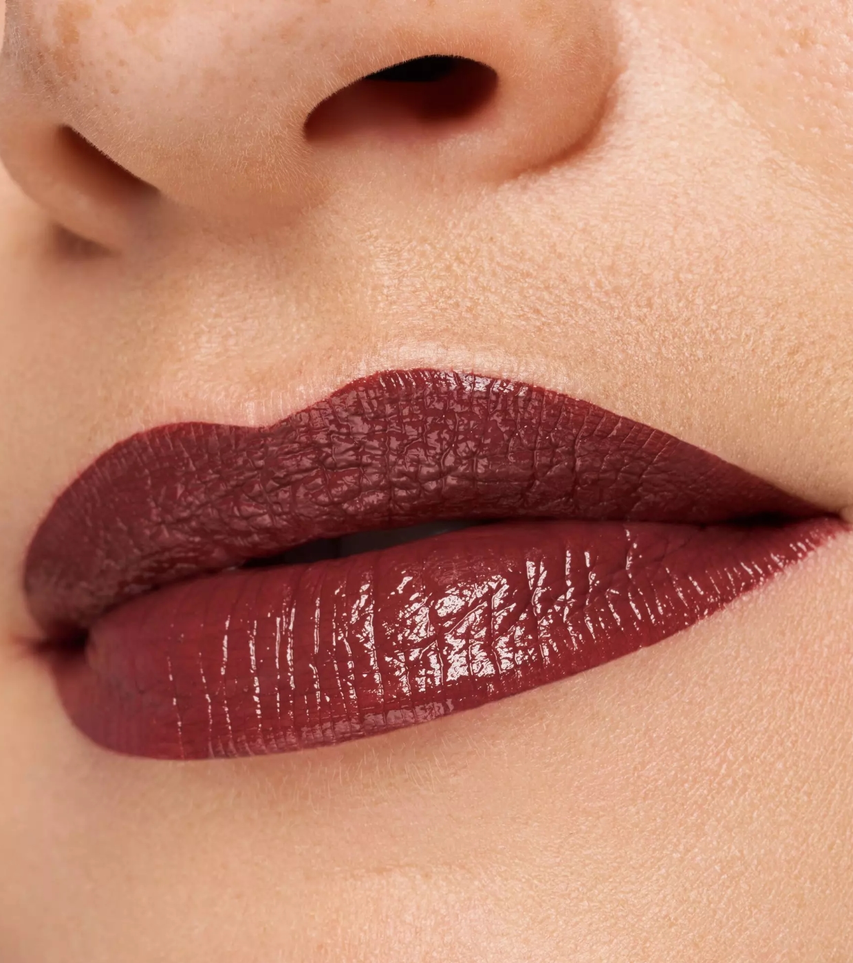 Sua fórmula cremosa e altamente pigmentada oferece cobertura total em uma única aplicação, deixando os lábios macios e confortáveis por horas.
