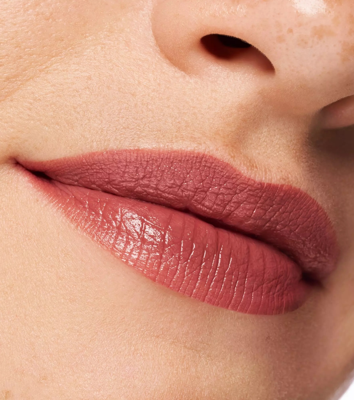 O acabamento acetinado equilibra perfeitamente um efeito mate elegante com um brilho luminoso, realçando o formato natural dos lábios com um resultado sofisticado.