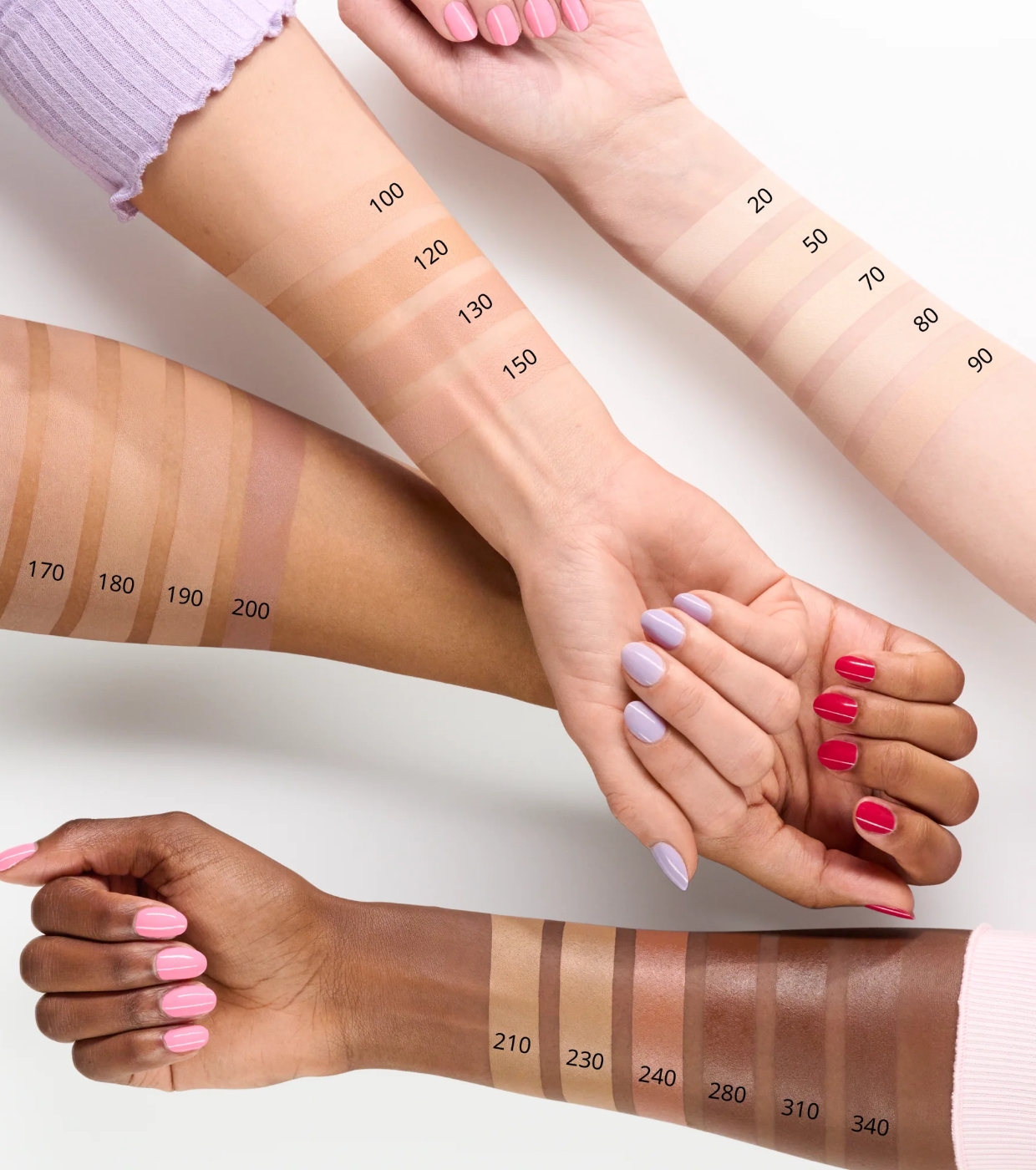 Sua textura fluida se mistura à pele e sua fórmula à prova d'água garante maquiagem duradoura o dia todo.