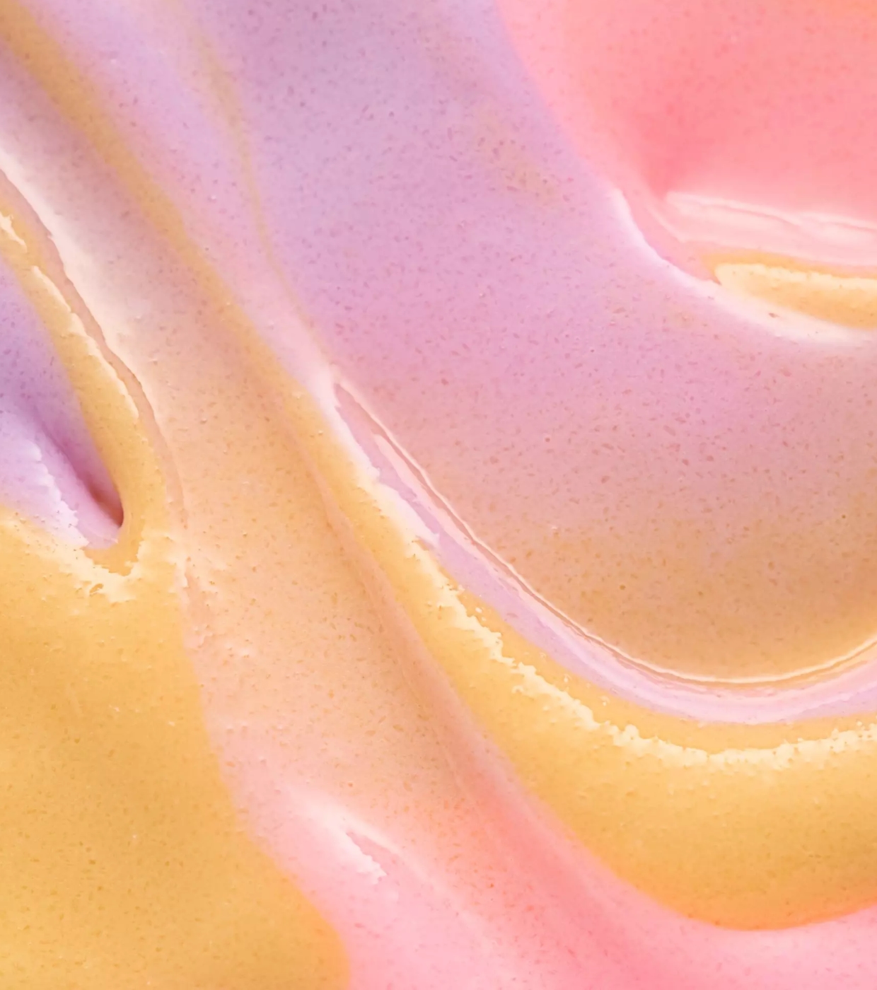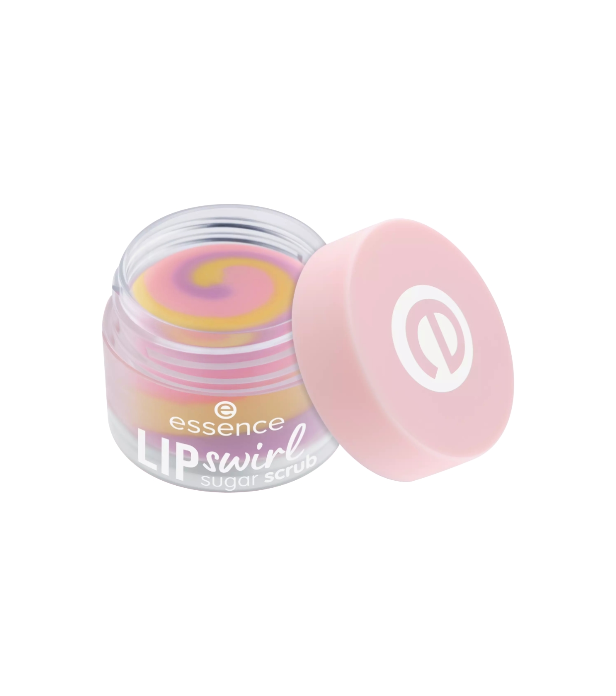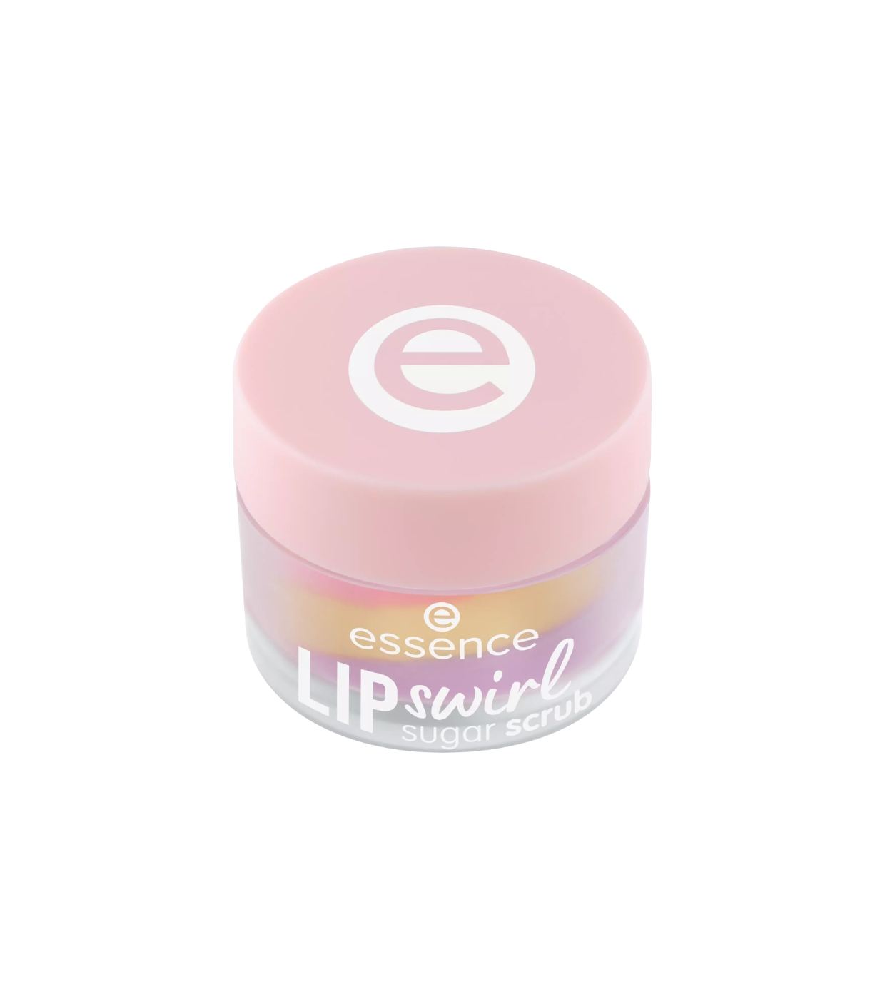 Essence Lip Sugar Scrub é um esfoliante labial divertido e eficaz com uma textura espiral de três cores (amarelo, coral e rosa) que se transforma em um bálsamo transparente após a aplicação.