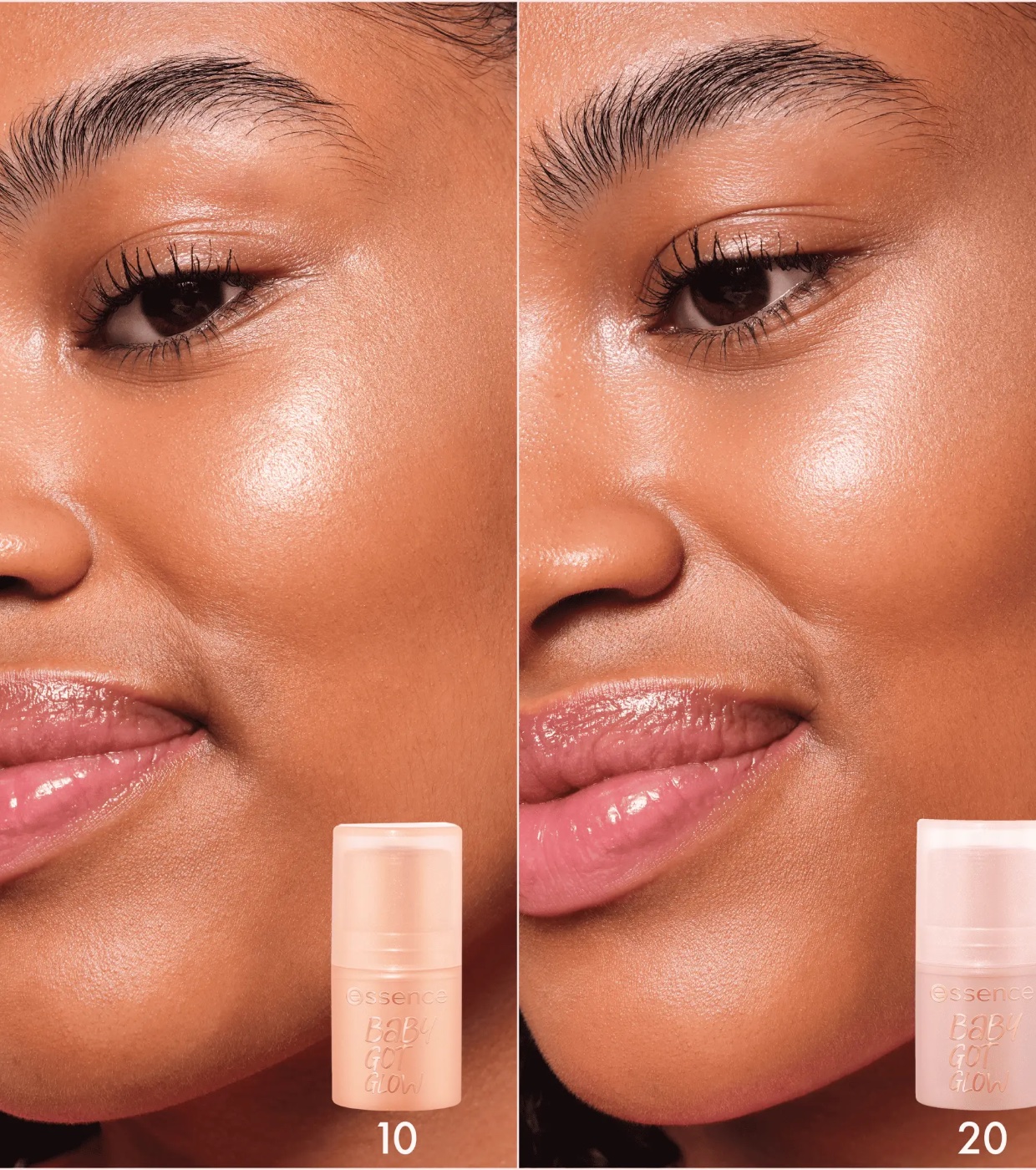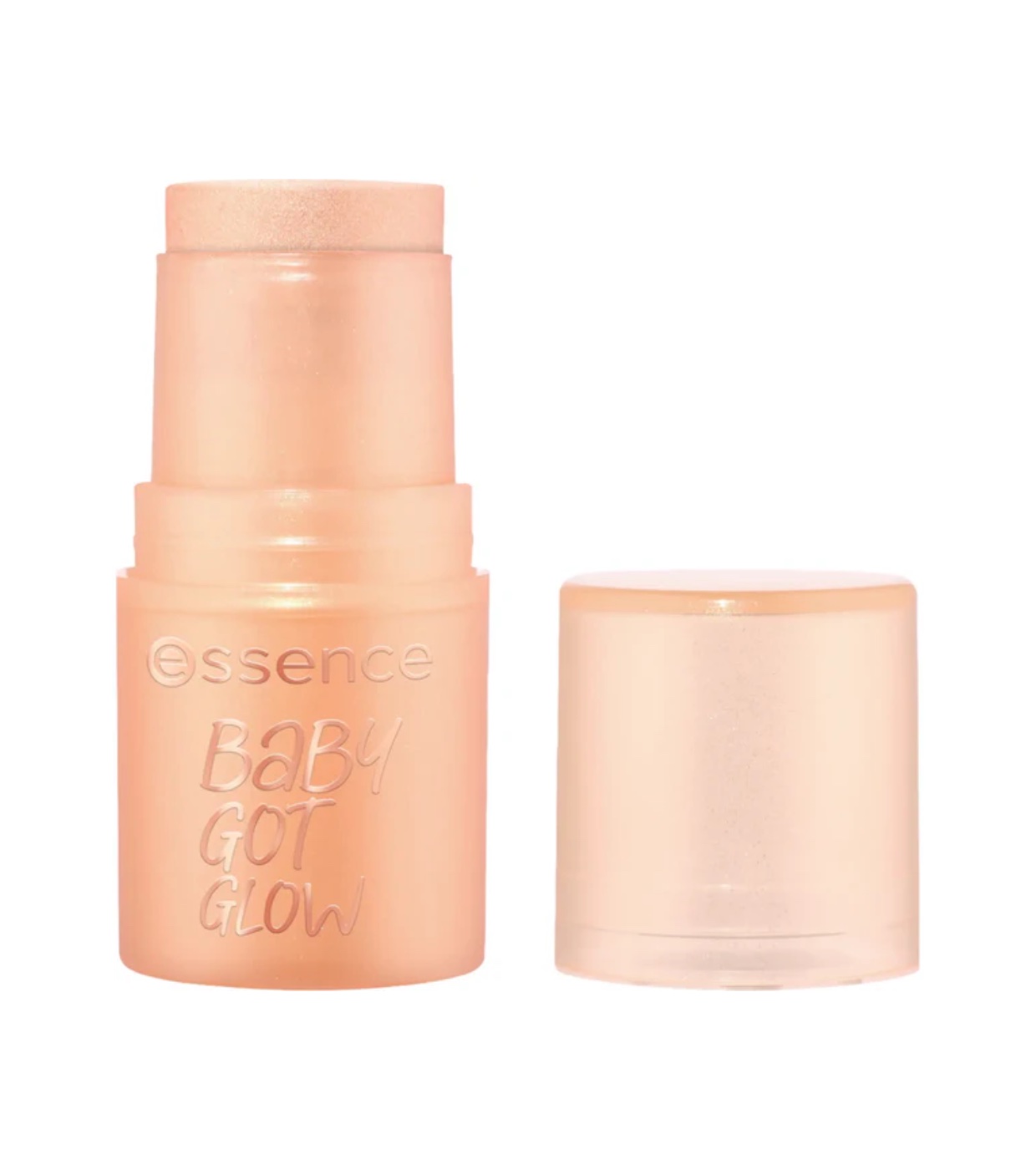 Brilhe em qualquer lugar com o iluminador em bastão Baby Got Glow Golden Aura da Essence em tom champanhe com acabamento luminoso.